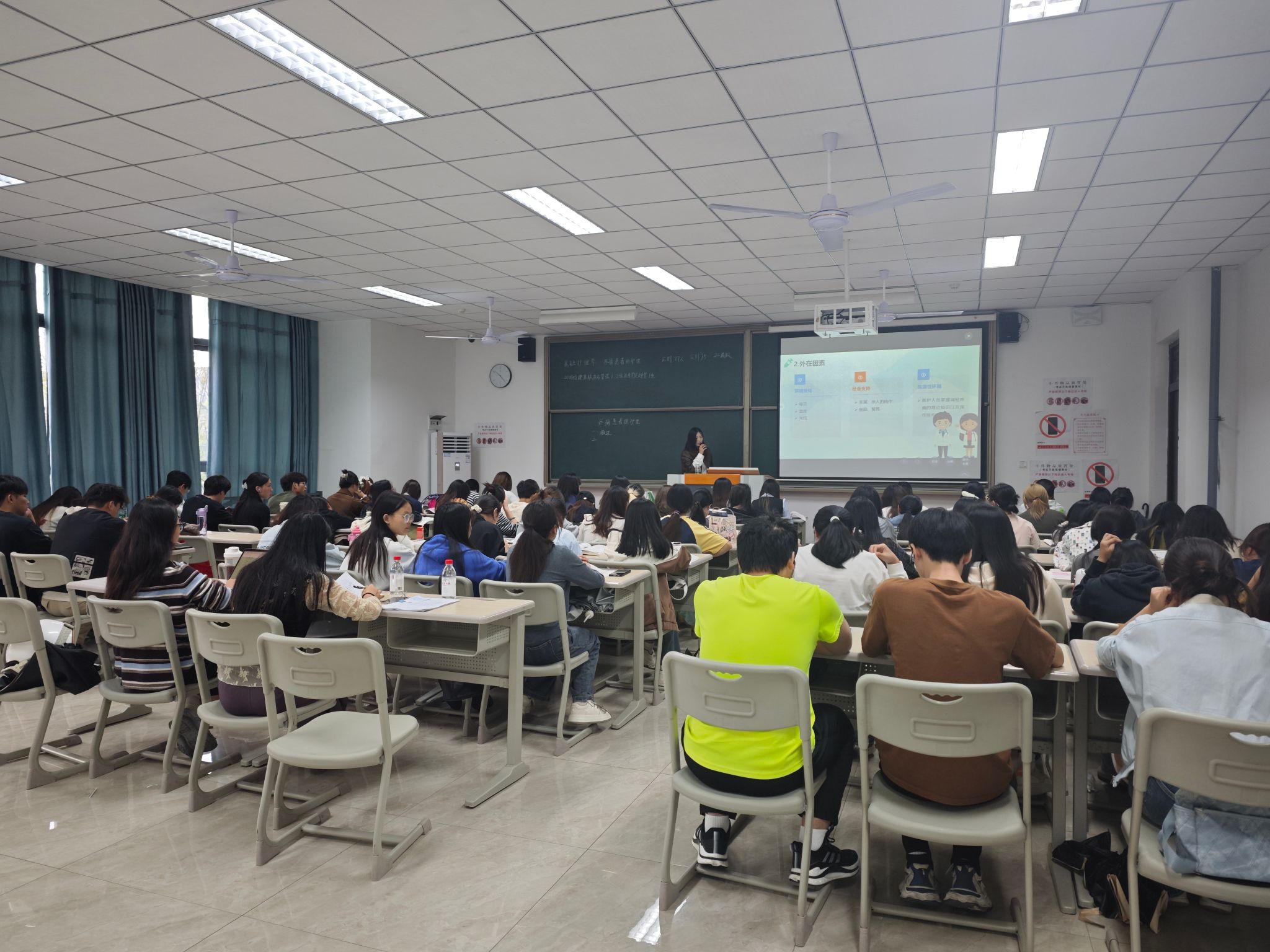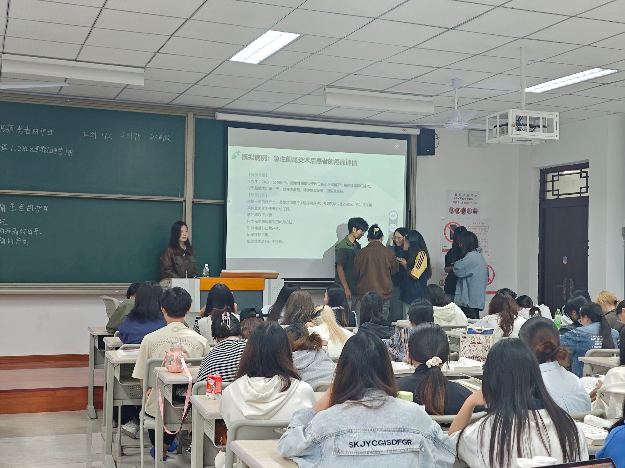 课程充分体现了“理论课堂,思维不设限”的理念。王老师设计了沉浸式情景模拟活动,学生分组扮演护士、患者及家属角色,基于给定案例进行疼痛评估与沟通的现场推演。这一设计将抽象的护理程序转化为可操作的对话与决策,极大地调动了学生们的参与热情,在思辨与协作中实现了理论知识的有效内化。