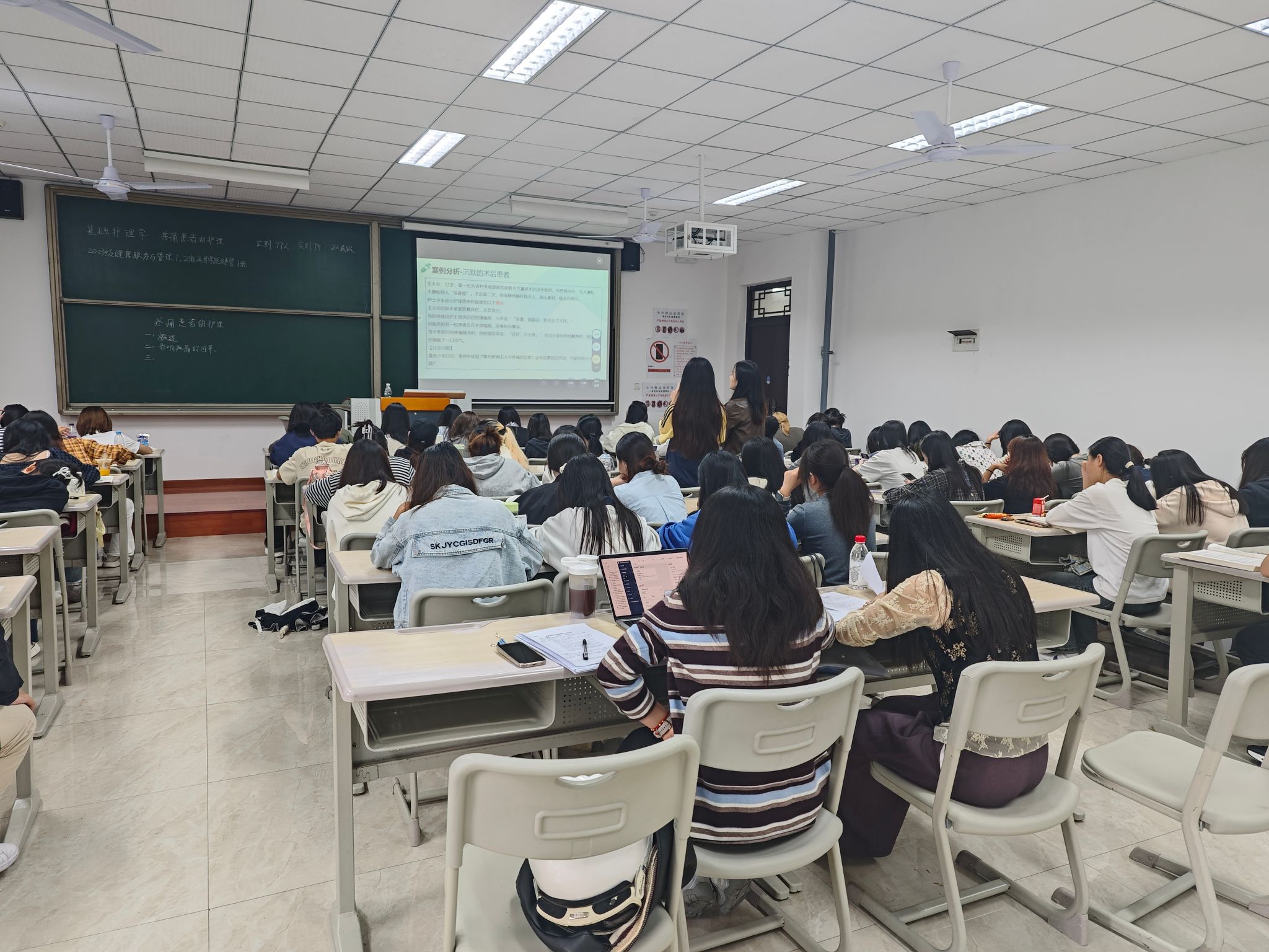 为积极响应学校课堂教学改革号召,进一步提升教师教学水平与课程实效性,2025年10月17日,大健康管理学院健康服务与管理教研室王智凤老师在仁者楼204教室组织开展了《基础护理学》中“疼痛患者的护理”章节随堂磨课教学研讨活动。本次活动特邀学院资深讲师姜晴秋、杨倩倩、任家兴老师担任指导专家,同时邀请同教研室左金山老师参与观摩与交流,聚焦疼痛评估与护理干预的教学策略与课堂实施。