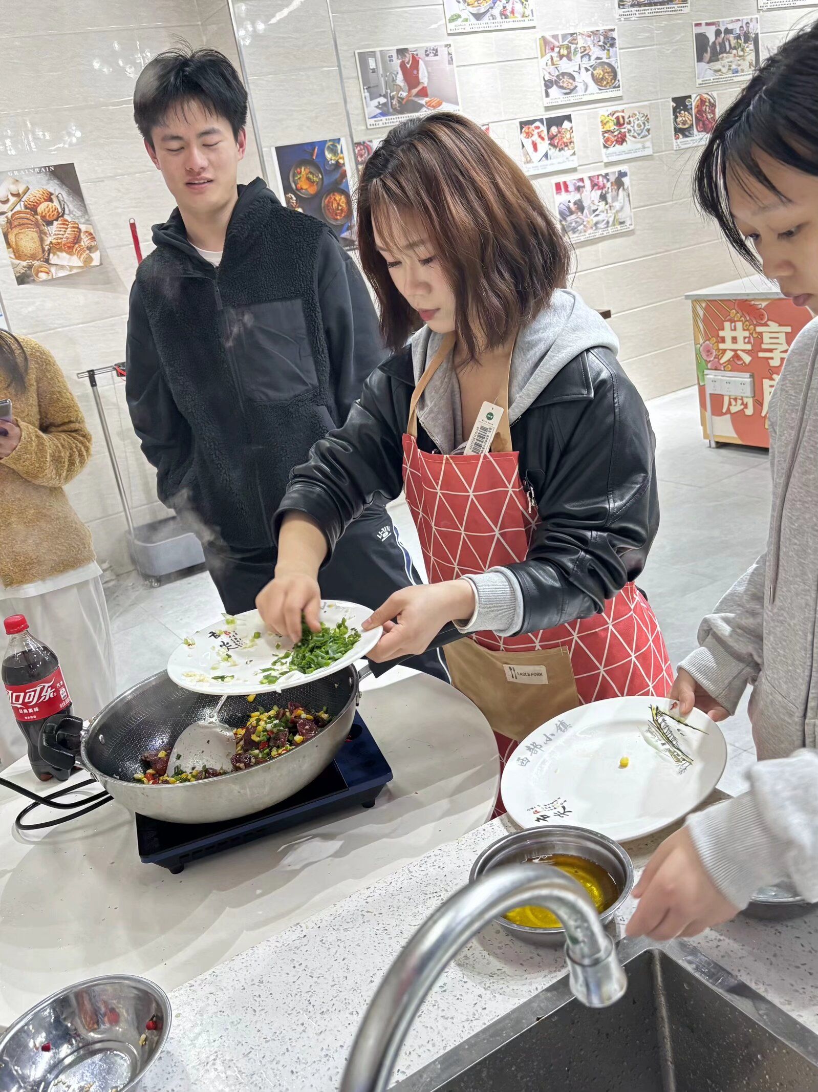 在烹饪过程中,同学们互相交流、互相学习,分享着各自家乡的特色美食和烹饪技巧。郑念老师也积极参与其中,不仅为同学们提供了专业的烹饪建议,还分享了许多生活中的趣事和感悟,现场气氛十分活跃。经过一个多小时的努力,一道道色香味俱全的菜肴终于呈现在大家面前,有蒜香虾、辣子鸡、酸辣土豆丝等,同学们围坐在一起,品尝着自己的劳动成果,脸上洋溢着幸福的笑容,欢声笑语回荡在整个厨房。