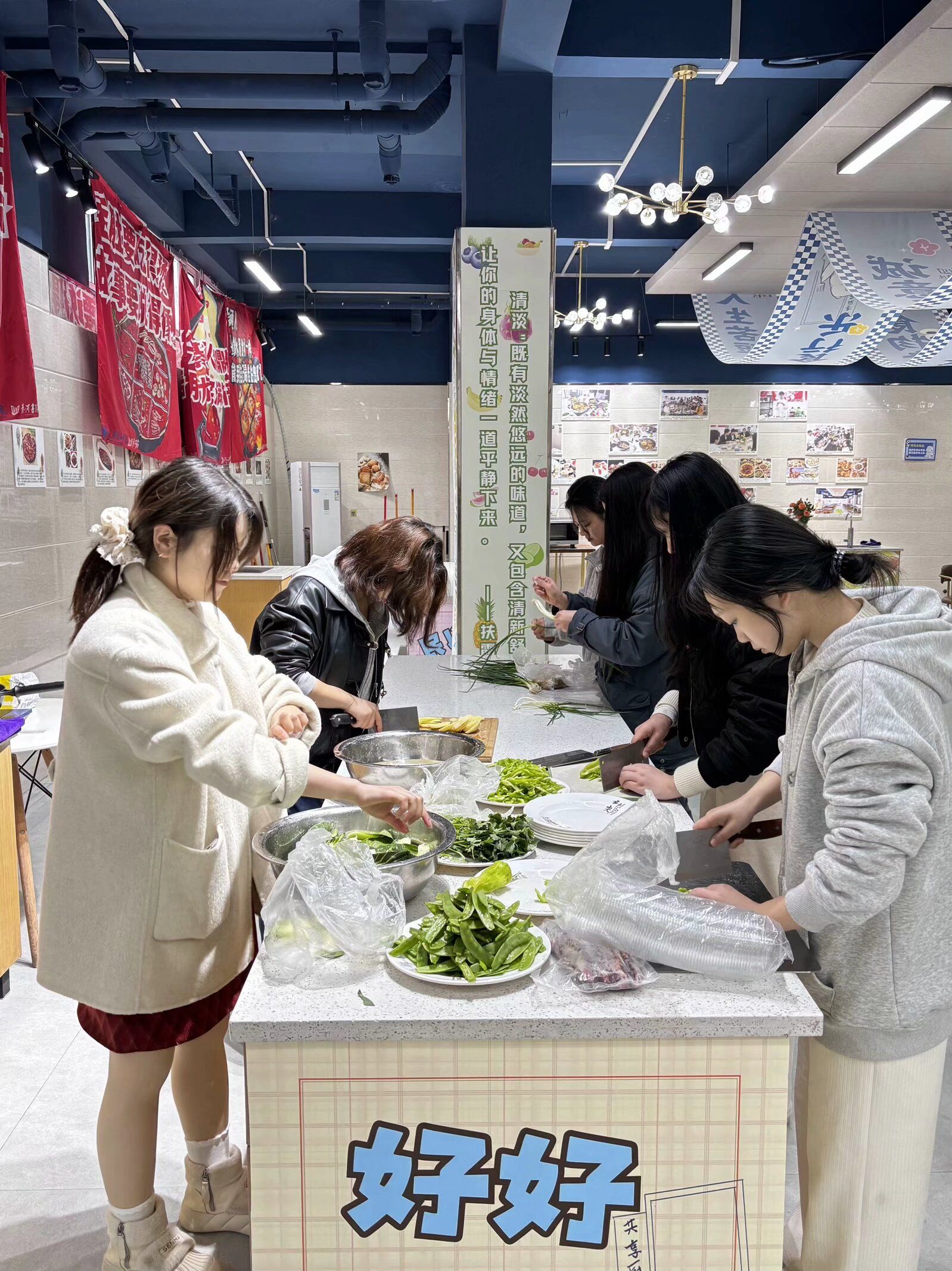 活动当天,同学们怀着激动与期待的心情早早地来到了共享厨房。在郑念老师的引导下,大家迅速分组并投入到食材的准备工作中。洗菜组的同学在水池边认真地清洗蔬菜,去除泥沙;切菜组则在案板上将土豆、胡萝卜等食材切成各种形状,不一会儿,厨房里就弥漫着食材的香味。