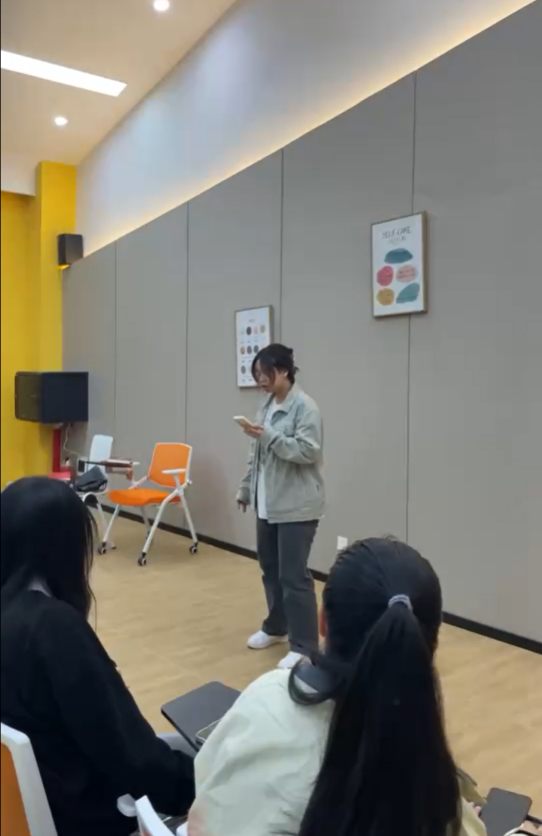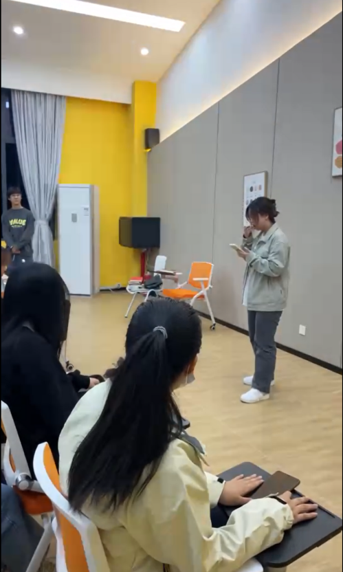 然后由35位异科生做自我介绍。2022级大健康管理学院体育经济与管理3班的夏华尧同学非常开朗活泼,主动调节气氛,在简要的自我介绍之后,主动担任小主持人,依次引导其他同学进行自我介绍,并邀请2022级大健康管理学院体育经济与管理3班付诗琪同学带来一段美声演唱,付诗琪同学带来的演唱获得了大家的整整掌声,整个过程气氛活跃,同学们都各怀才艺,兴趣爱好广泛。