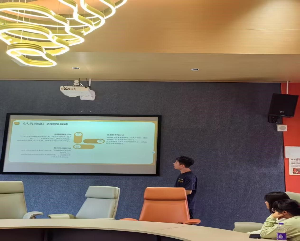 分享会现场,主讲人自信地站在屏幕前,借助精心制作的 PPT,对《人类简史》展开了一场妙趣横生的解读。PPT 首页,“《人类简史》的趣味解读” 几个大字以独特的字体设计格外醒目,瞬间抓住了台下参与者的目光。在后续的讲解中,主讲人围绕书中独特的叙事视角,如从全新的全球史角度审视人类发展历程,深入浅出地剖析;同时,也着重阐述了书籍给予自我思考的启迪。台下,参与者们整齐地围坐于圆桌旁,全神贯注,目光紧紧跟随主讲人的讲解,不少人还不时低头记录重点。