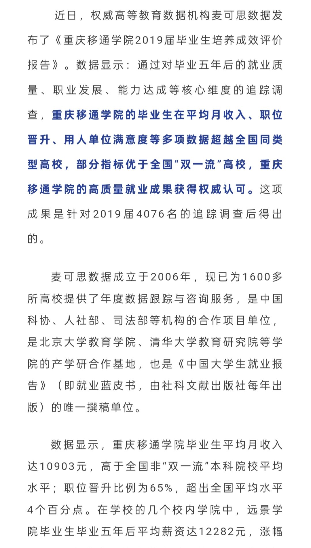 麦可思数据显示:重庆移通学院成为高质量就业高校