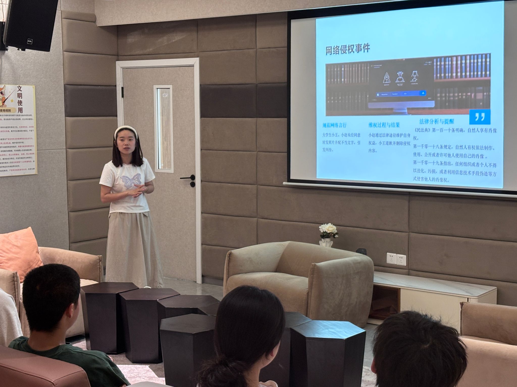 活动以法治安全教育为开篇,张璐老师聚焦校园贷、学术不端、网络侵权等热点问题,以沉浸式教学引发学生共鸣。在校园贷风险警示环节,老师播放改编自真实事件的短剧,生动呈现当事人从借贷到债务缠身的全过程,随后结合典型案例,深入剖析不良借贷的危害,引导学生树立理性消费观。在学术诚信教育中,“学术侦探游戏”将课堂氛围推向高潮,学生分组对多篇问题论文片段进行“找茬”,在热烈讨论中掌握学术规范要点。张璐老师强调:“坚守学术诚信是每个专业人的责任。”