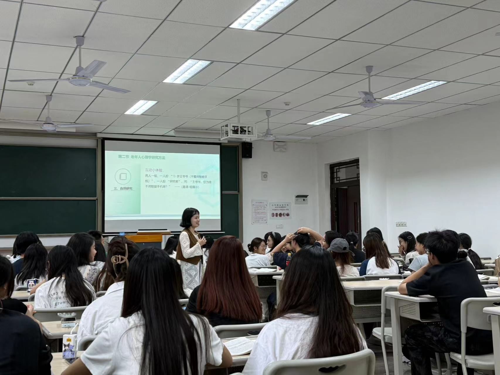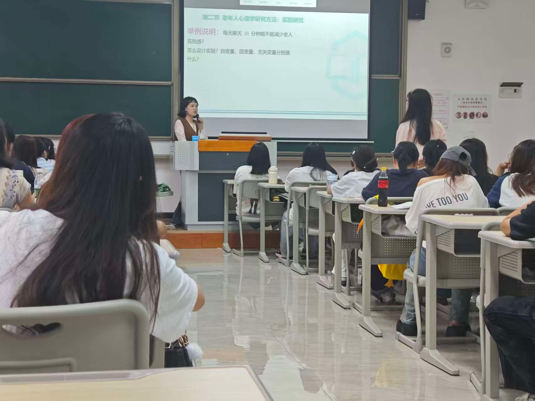 课堂上,龙现珍老师围绕课程第二节“老年心理学的研究方法”与第三节“老年心理学的模型”核心内容展开教学,结合老年群体心理研究实例,清晰讲解实验研究、相关研究等方法的应用场景,以及生物-心理-社会模型等理论的实践意义,通过互动提问引导学生思考,课堂氛围活跃。听课教师重点记录教学环节设计、重难点突破及学生反馈情况。