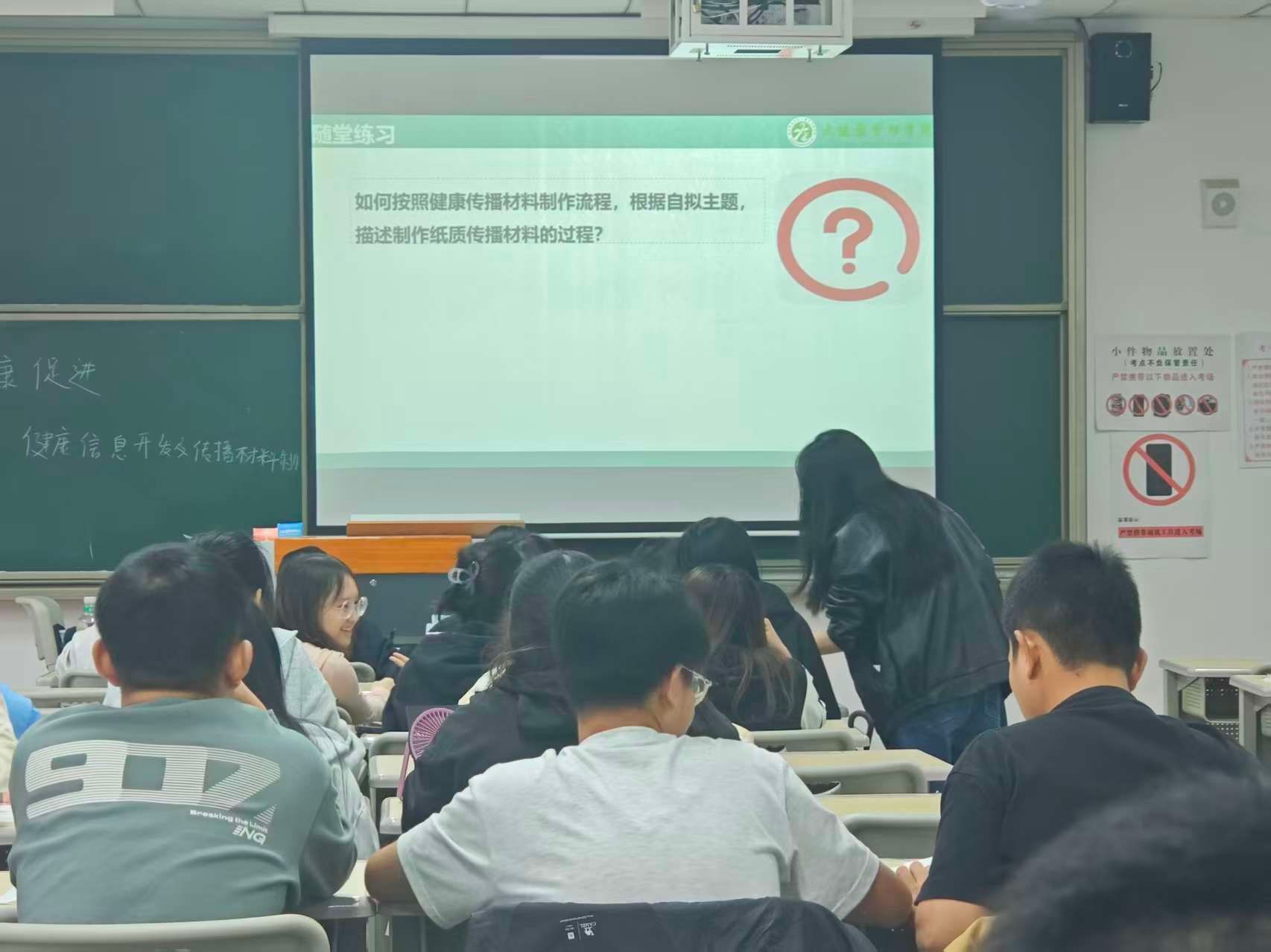 课堂教学环节,曾华英老师组织学生分组汇报自制健康传播材料。各小组围绕慢性病预防、心理健康等主题展示作品,课堂秩序井然,互动良好。曾老师适时点评,并结合案例解析制作要点,增强教学实用性。
