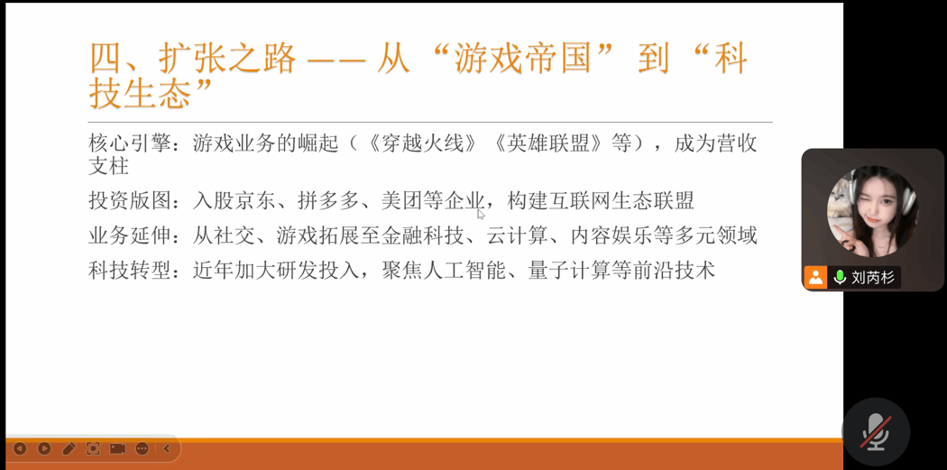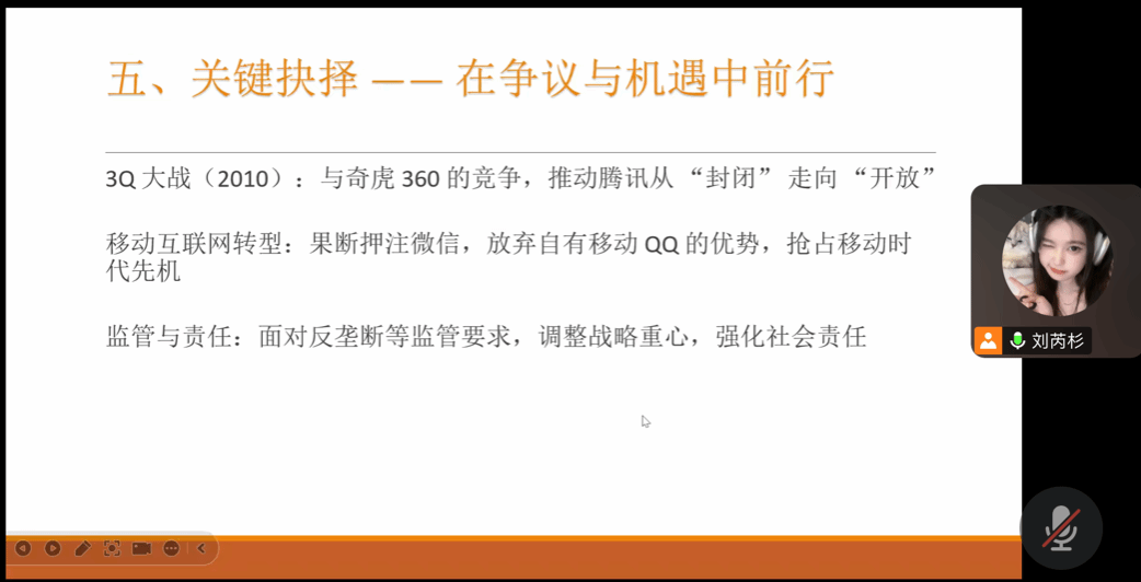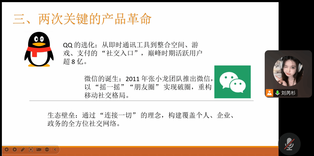 谈及腾讯的两次关键产品革命,郭雅兰同学介绍道,QQ从即时通讯工具进化为整合空间、游戏、支付的“社交入口”,巅峰时期活跃用户超8亿;2011年张小龙团队推出的微信,以“摇一摇”“朋友圈”实现破圈,重构了移动社交格局。腾讯通过“连接一切”的理念,构建起覆盖个人、企业、政务的全方位社交网络,形成了强大的生态壁垒。