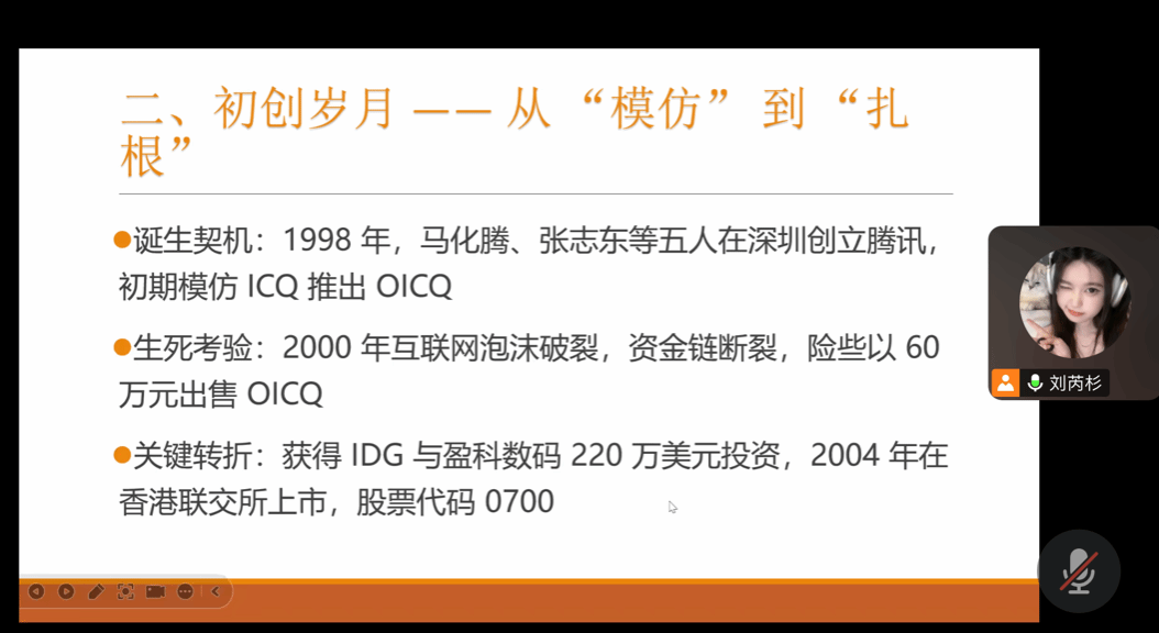 在分享腾讯初创阶段的经历时,郭雅兰同学讲述了1998年马化腾、张志东等五人在深圳创立腾讯,初期模仿ICQ推出OICQ的故事。面对2000年互联网泡沫破裂带来的资金链断裂危机,腾讯险些以60万元出售OICQ,好在关键时刻获得IDG与盈科数码220万美元投资,并于2004年在香港联交所上市,从此扎下根基。这段跌宕起伏的创业史,让同学们深刻感受到了创业的艰辛与机遇并存。