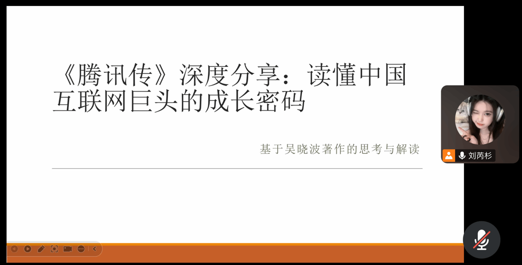 郭雅兰同学以《腾讯传》为蓝本,从书籍的作者与创作背景入手,详细介绍了这部由吴晓波撰写的纪实作品。书中聚焦腾讯1998年创立至2016年的发展历程,不仅梳理了腾讯从QQ起步,到推出微信、布局游戏与社交生态的关键节点,还还原了其在互联网浪潮中面临的危机与决策,如3Q大战、战略转型等,为同学们呈现了一幅生动的中国互联网行业发展画卷。