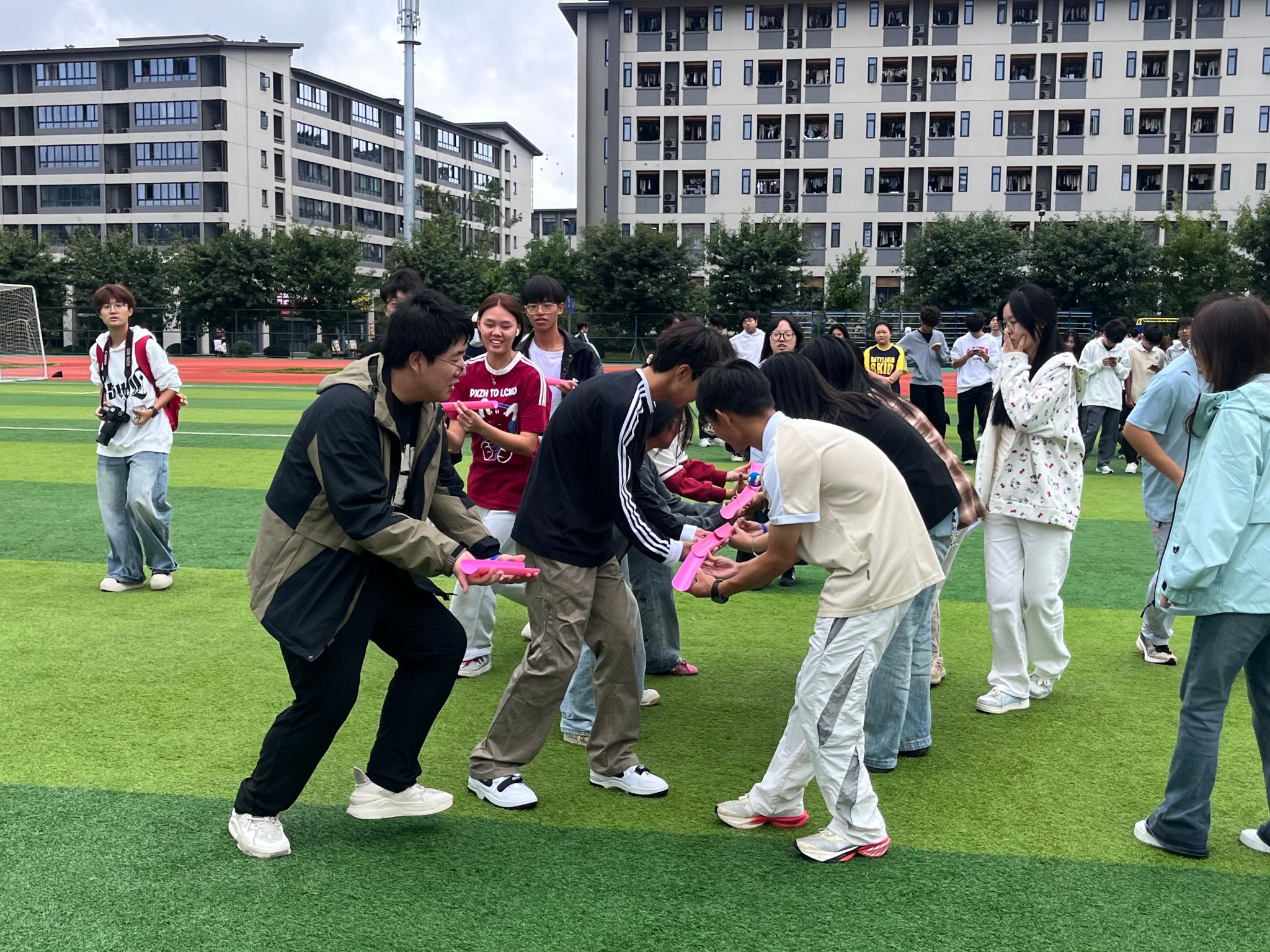 本次活动作为“十月文明习惯养成计划”的线下延伸,旨在通过趣味协作游戏,进一步深化室友之间的情感联结,营造和谐融洽的寝室文化氛围。活动设置了“击鼓颠球”“南水北调”“穿越扁带”等多个团队协作项目,同学们在游戏中互相配合、默契十足,展现出良好的团队精神与凝聚力。