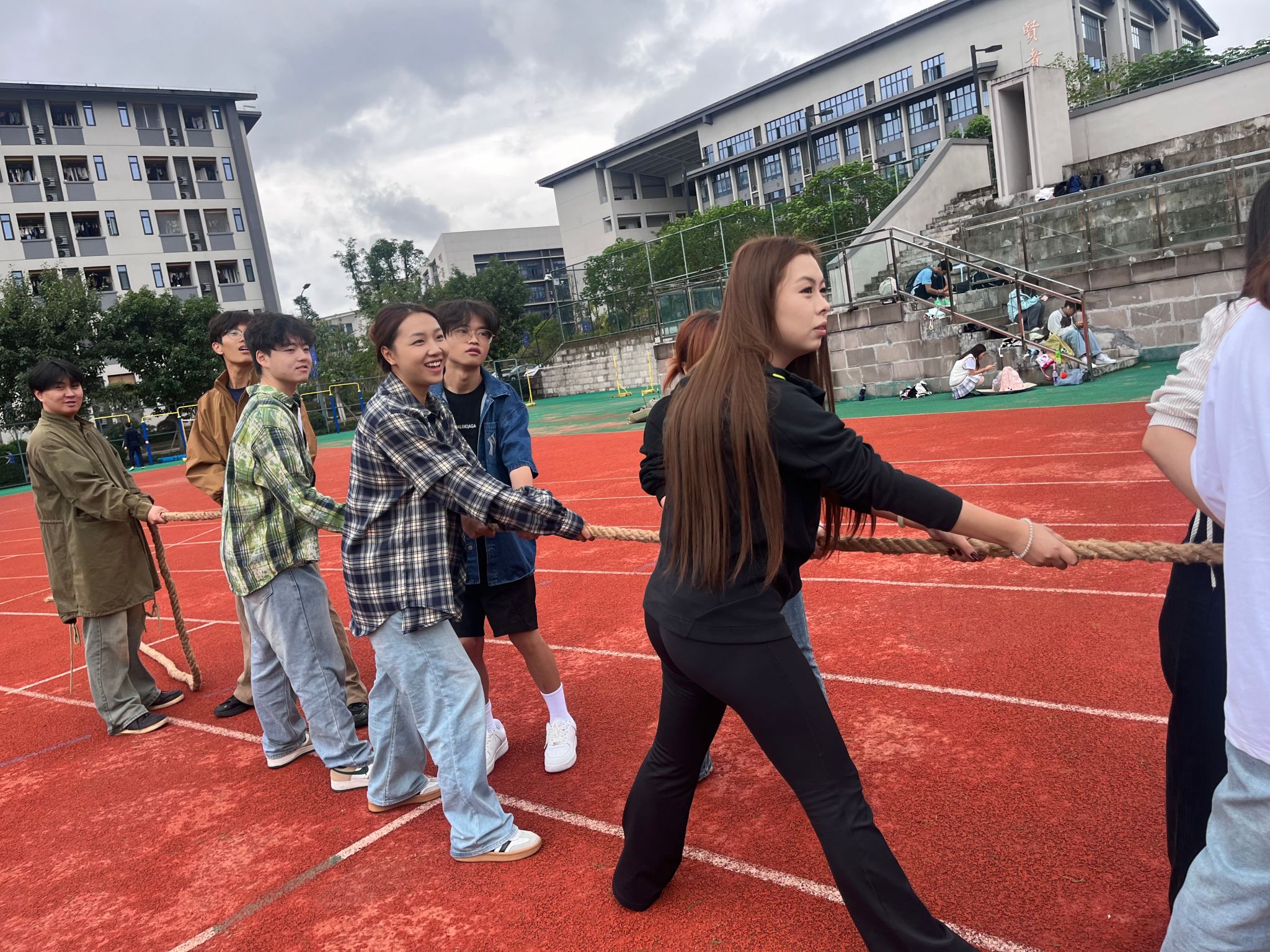 值得一提的是,原定于最后的“神笔马良”游戏临时调整为拔河比赛。随着哨声响起,师生齐上阵,呐喊声、助威声此起彼伏,将现场气氛推向高潮。罗老师也与学生们一同紧握绳索,全力以赴,在力量的较量中拉近了彼此的距离,也增强了集体的归属感。