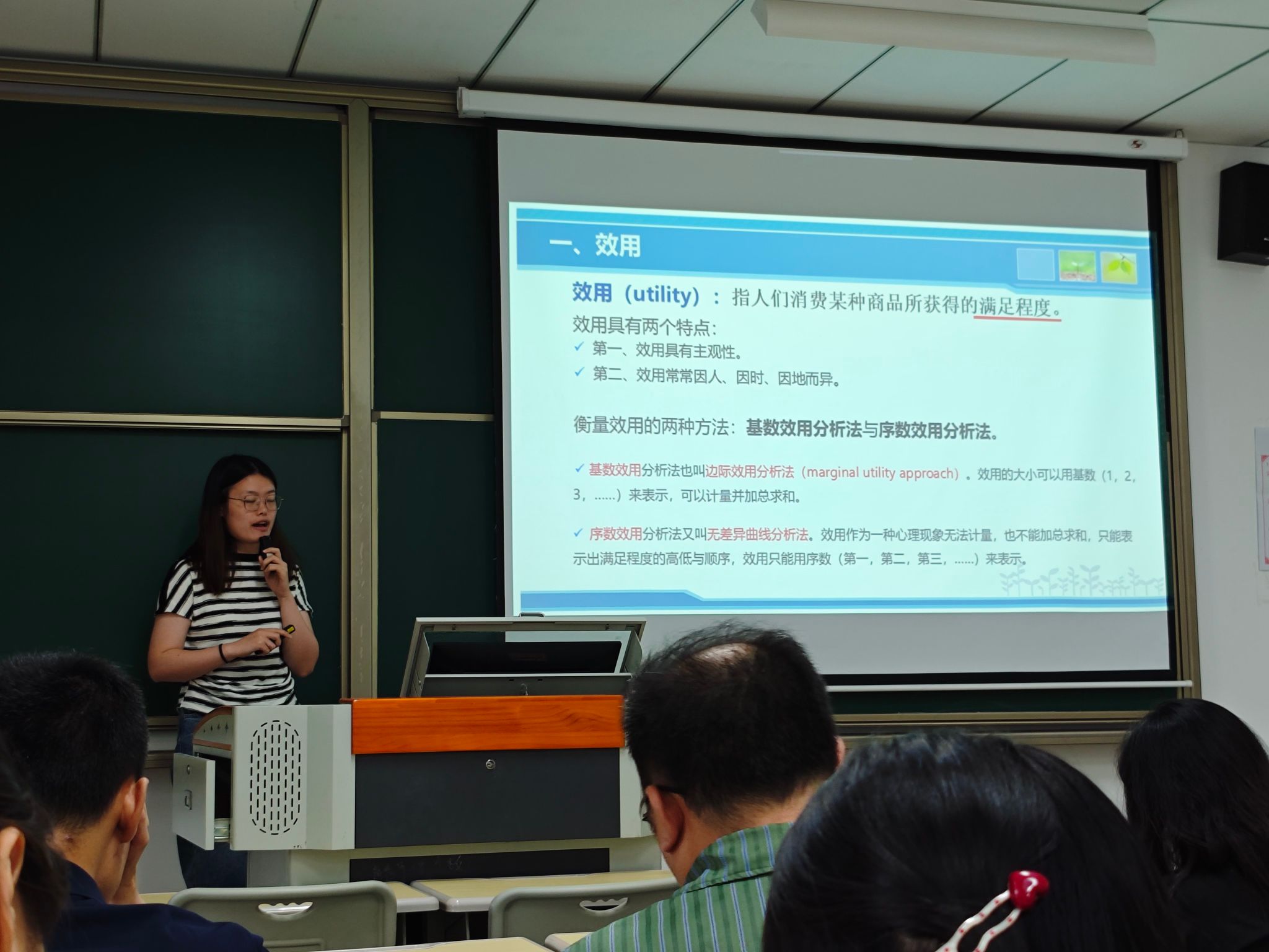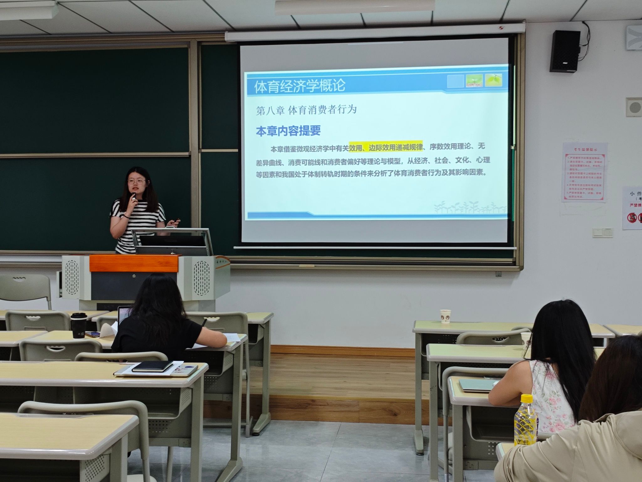 随后,苟婷婷老师带来了《体育经济学概论》课程的授课展示,围绕“第八章 体育消费者行为”展开了系统讲解。她以“效用”概念切入,从“什么是效用”“效用的度量方式”到“边际效用递减规律”,层层深入,引导学生从生活经验出发理解抽象理论。苟老师采用图文并茂的方式,逐一讲解“基数效用分析法”和“序数效用分析法”,通过PPT呈现比较两种分析路径在体育经济行为研究中的适用场景,提升了课堂的学术深度与实践关联度。