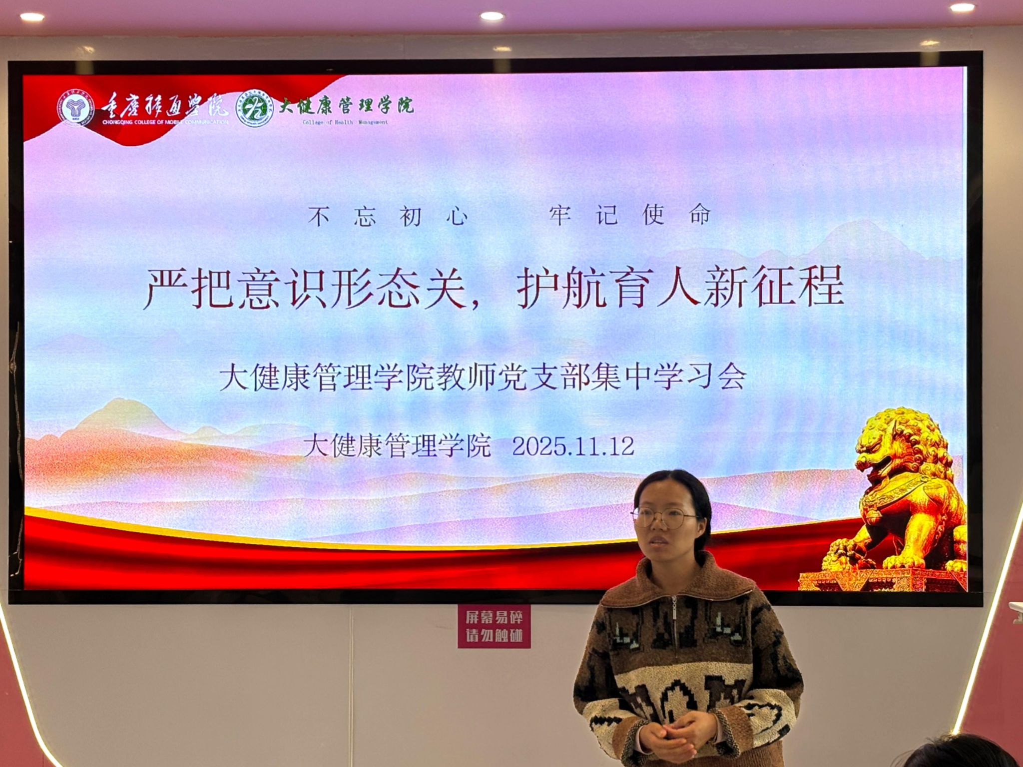 为深入贯彻落实校园意识形态精神,筑牢思想阵地,并切实提升教育教学质量,11月12日,大健康管理学院教师党支部在丁山书院107射手座多功能空间开展“严把意识形态关,护航育人新征程”集中学习会。本次学习会由大健康管理学院教师党支部书记张红主持。