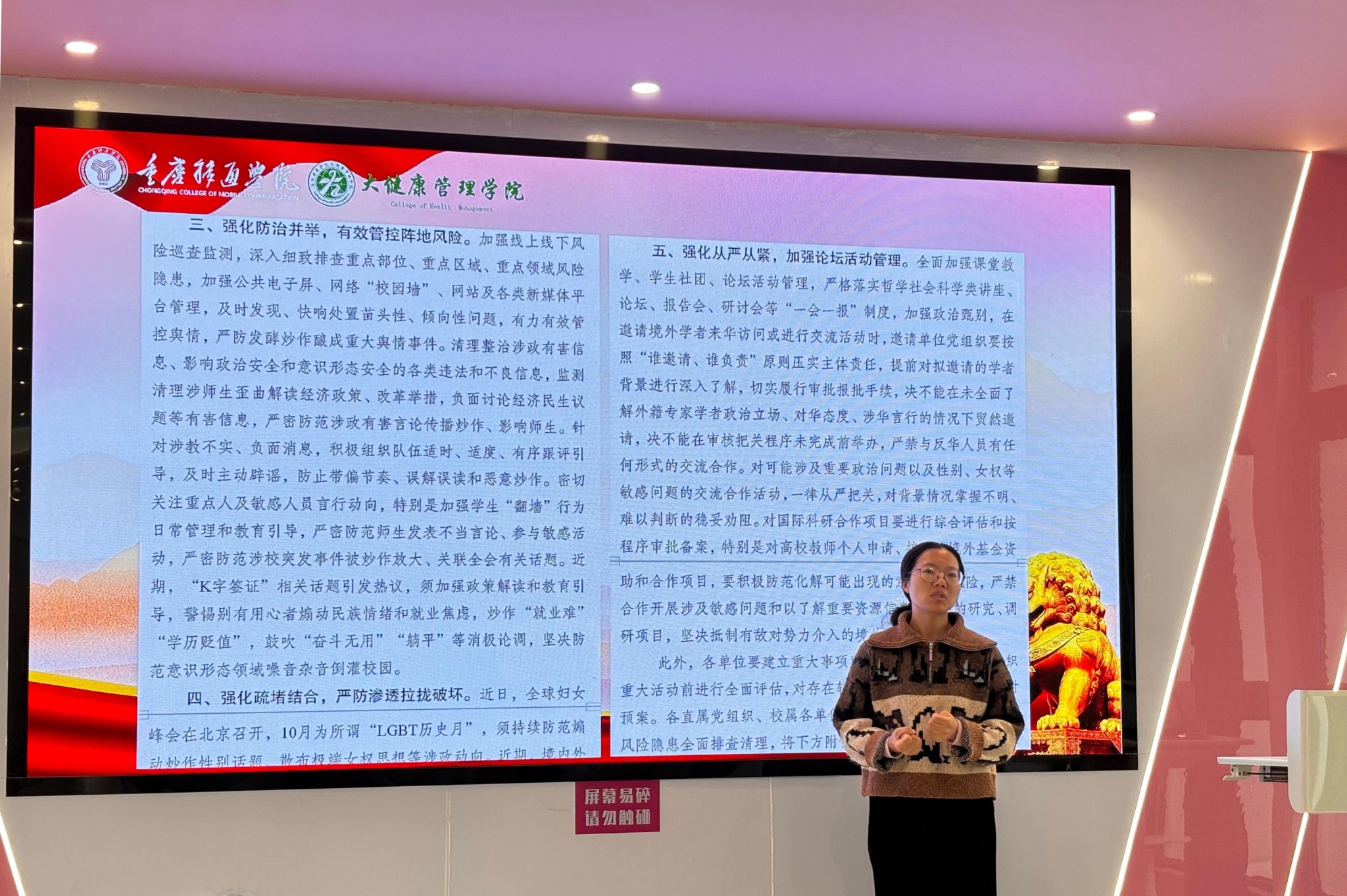 学习会首先围绕意识形态工作展开。与会党员教师集体认真学习了《中共重庆移通学院委员会关于加强校园意识形态阵地管理的通知》文件。通过深入学习,大家进一步明确了在新形势下加强意识形态工作的极端重要性,强化了为党育人、为国育才的初心使命,表示要将文件精神内化于心、外化于行,切实守好课堂教学、学术交流等各类育人阵地。
