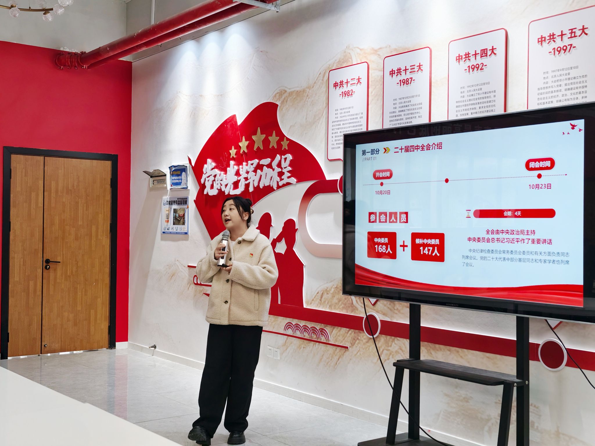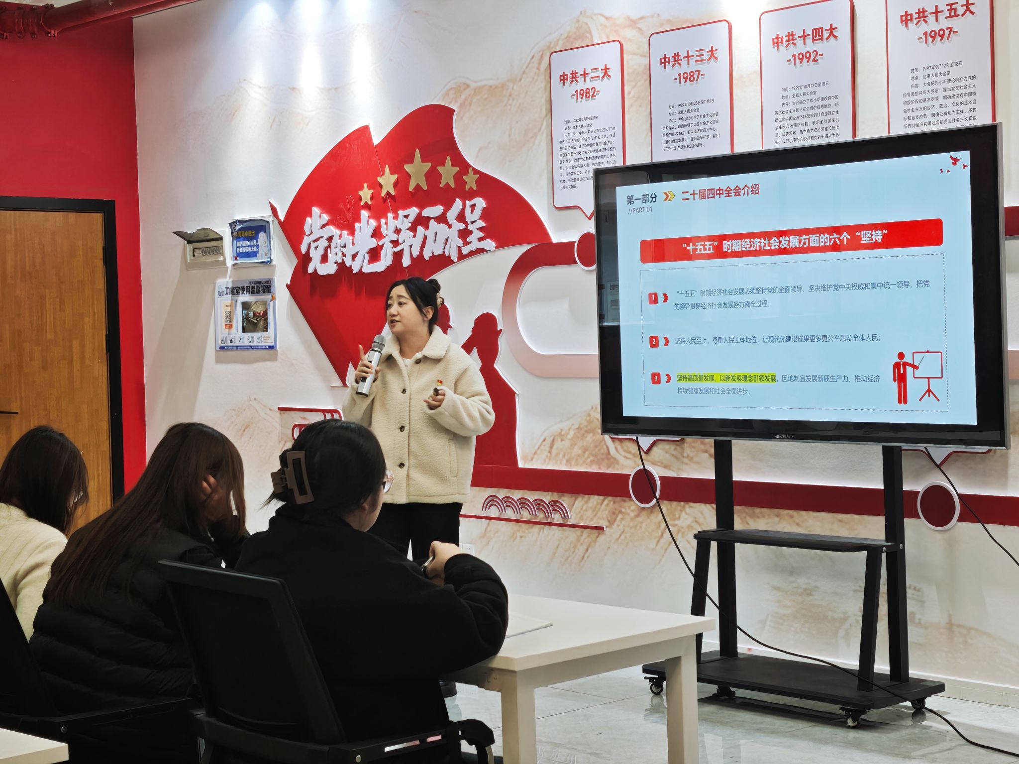 何苗老师围绕党的二十届四中全会的基本情况、主要议程及公报内容进行了系统解读,重点阐释了“十五五”时期经济社会发展的“六个必须坚持”原则和主要目标。她结合当前形势与青年责任,强调高质量发展、科技创新、国家安全等方面的重要意义,鼓励青年党员将个人成长融入国家发展大局,以实际行动践行“青春使命”。