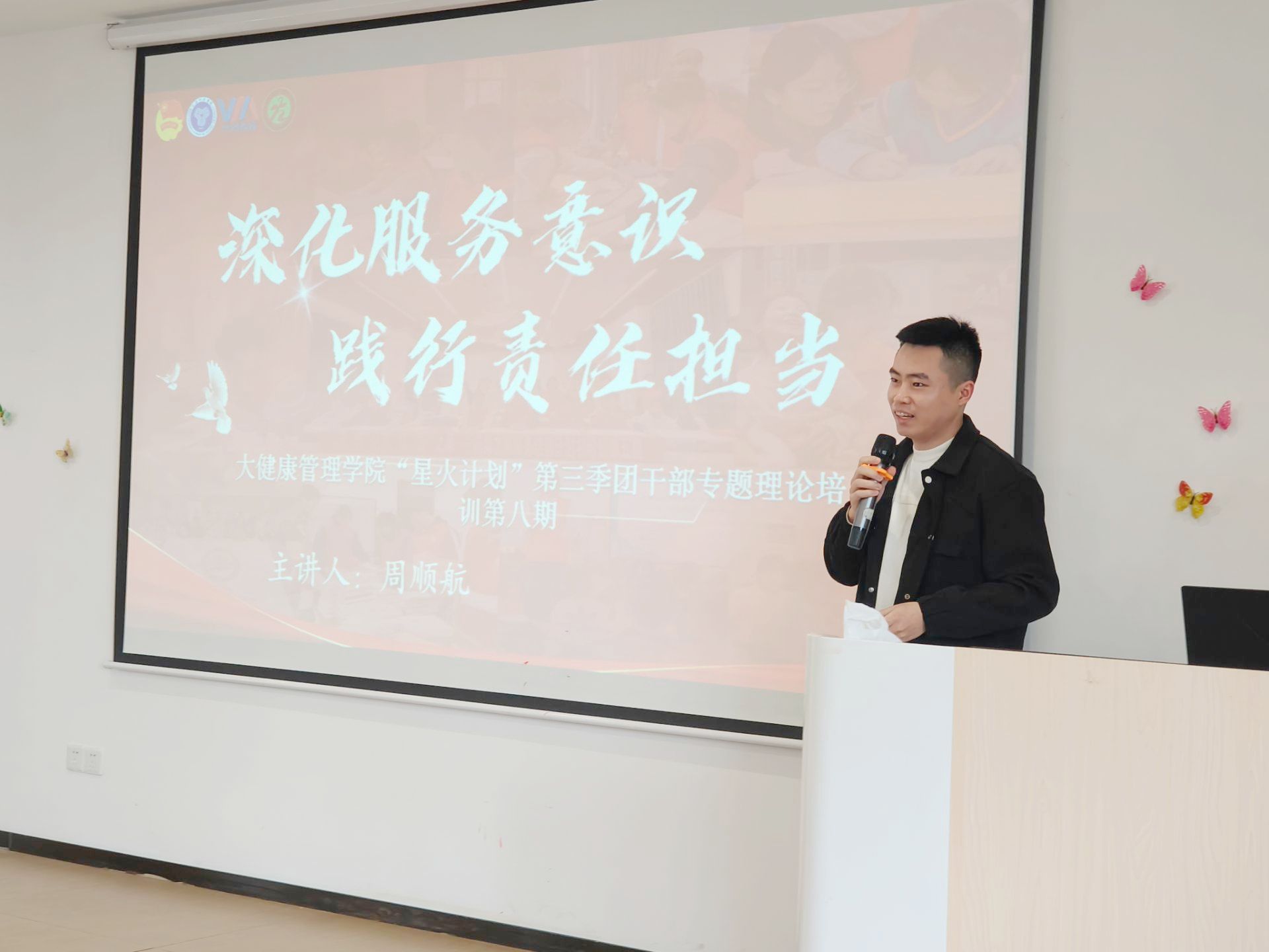 为积极响应学院对团干部素养提升的号召,进一步提升团干部的服务意识和责任担当精神,大健康管理学院于4月9日12时在南江书院庸言研讨互鉴讲堂举办“深化服务意识,践行责任担当”——大健康管理学院“星火计划”第三季团干部专题理论培训第八期。本次培训有幸邀请到大健康管理学院志愿服务板块指导老师周顺航老师作为本次活动的主讲嘉宾,为团干部们带来了一场生动的学习课堂。