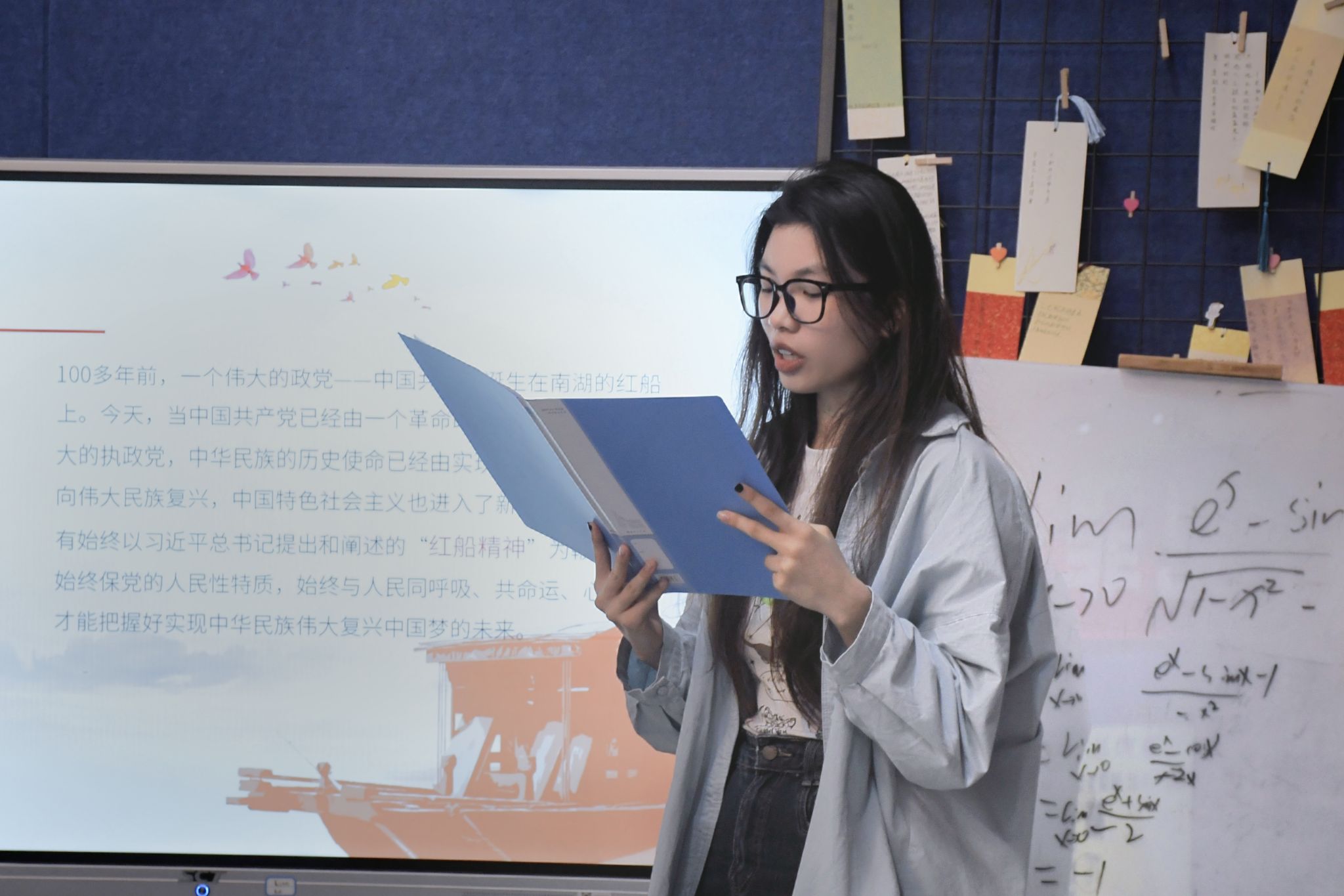 活动在《建党伟业》的激昂片段中拉开序幕,同学们仿佛穿越时空,回到了那个风云激荡的年代。影片中,中共一大代表们在嘉兴南湖的红船上,点燃了革命的火种,开启了中国共产党波澜壮阔的征程。主持人深刻解读了“开天辟地、敢为人先、坚定理想、百折不挠”的红船精神内涵,这十六个字如同灯塔,照亮了同学们的心灵。