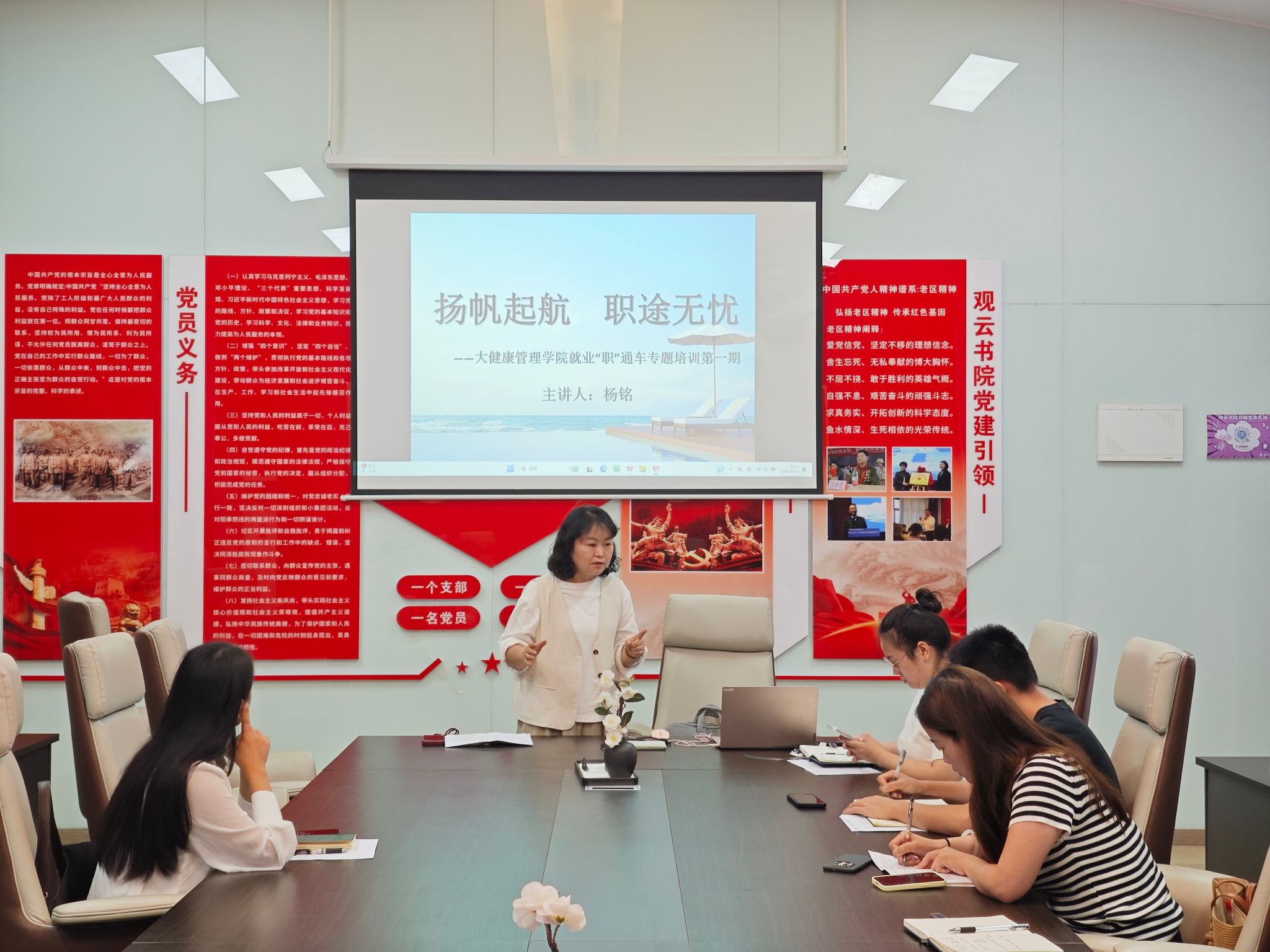 为全面提升毕业班辅导员的就业指导与服务能力,确保2026届毕业生就业工作顺利推进,大健康管理学院于10月17日上午举办了“扬帆起航,职途无忧”——大健康管理学院就业“职”通车专题培训第一期。本次培训由学院就创办主任杨铭主讲,学院党总支副书记童学容及全体毕业班辅导员参加培训。