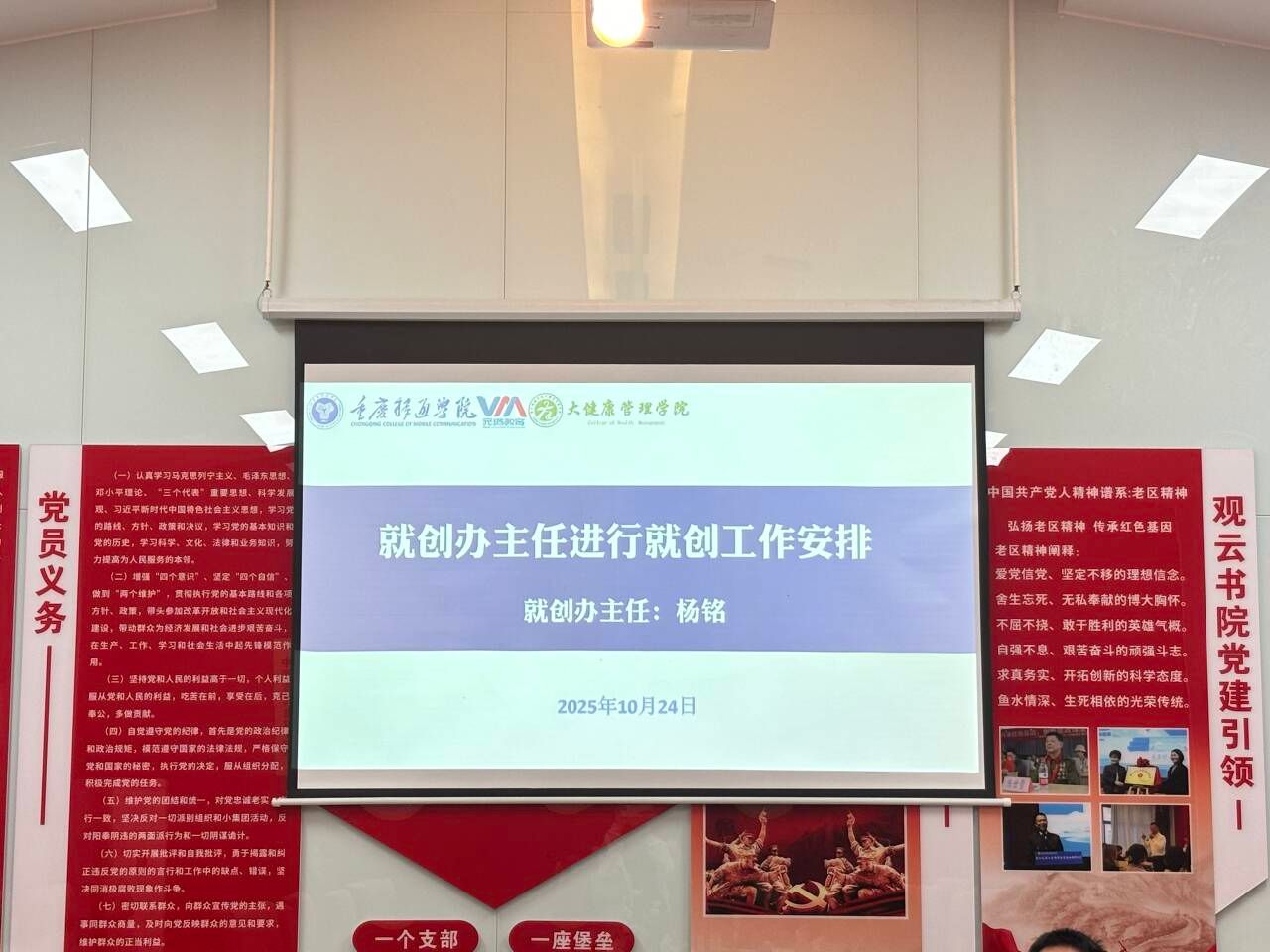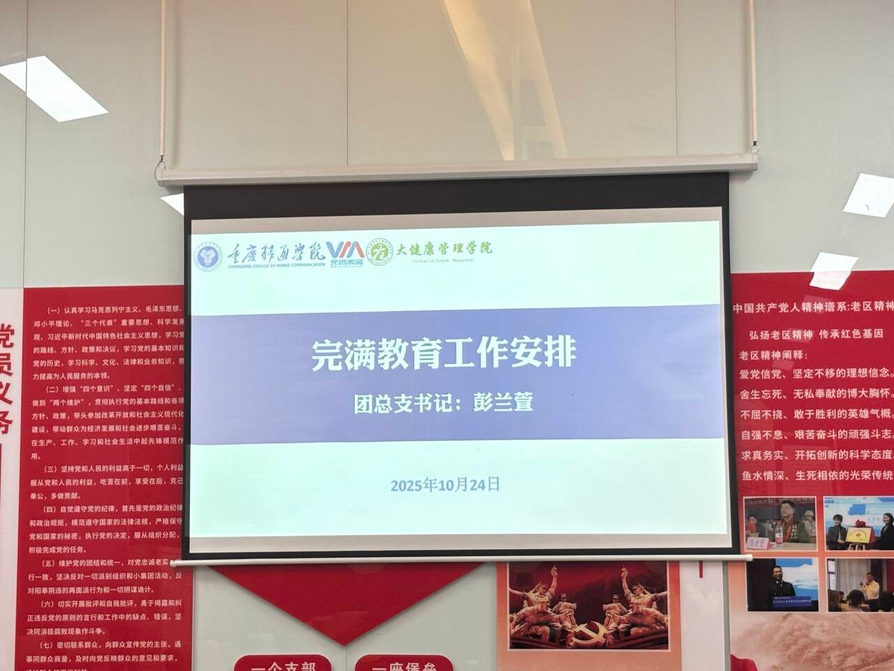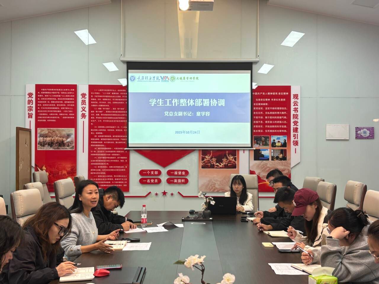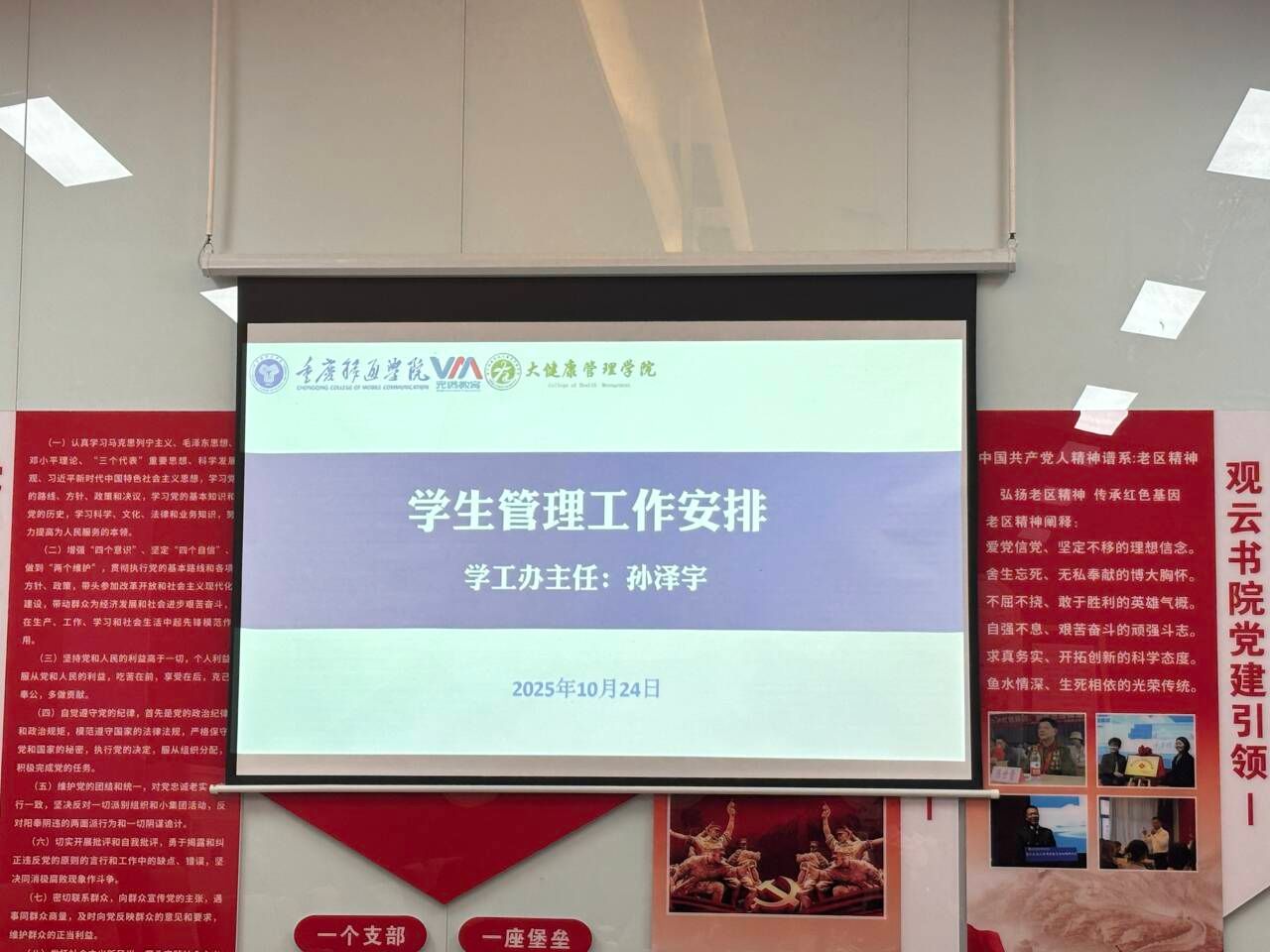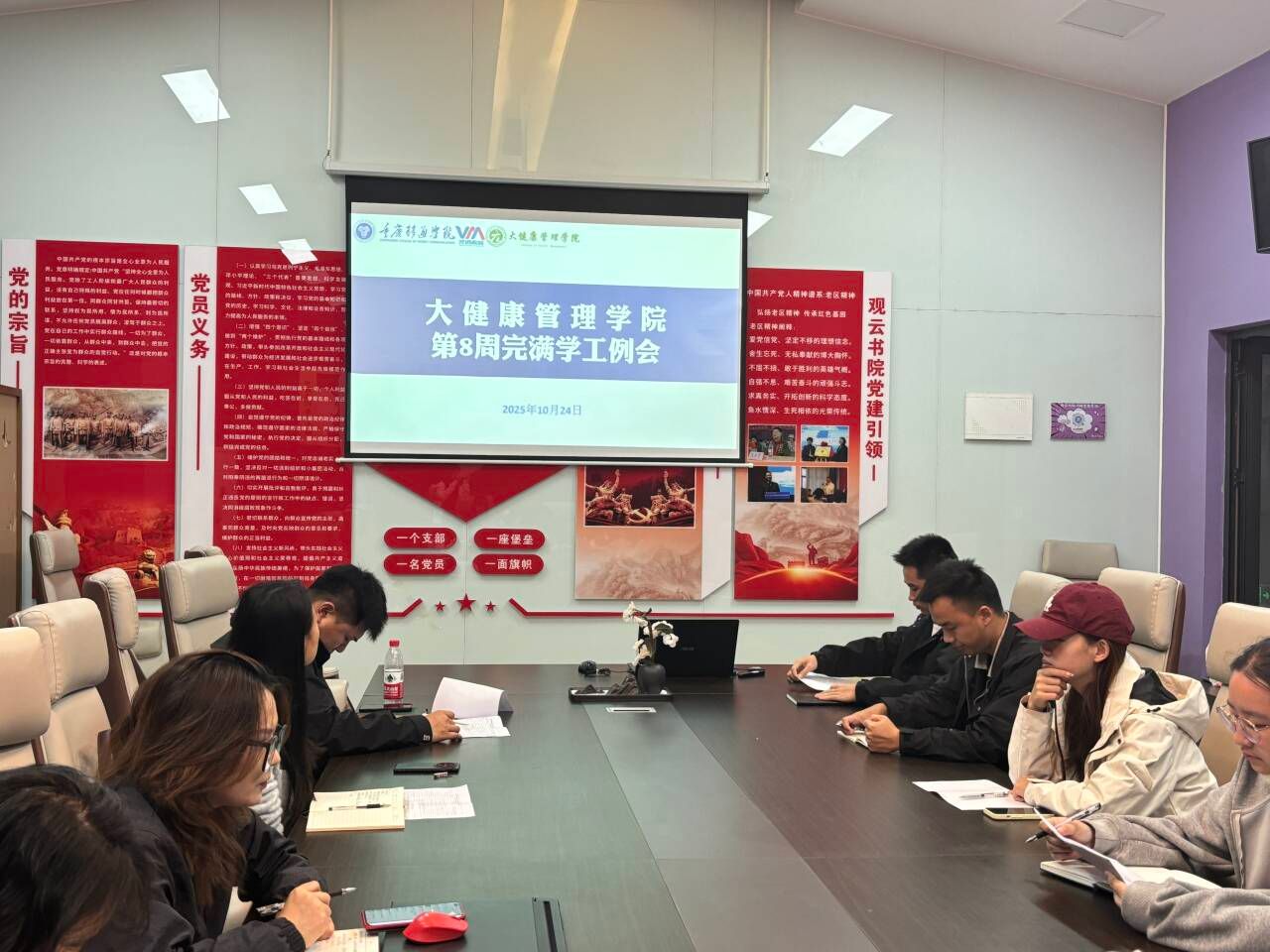 2025年10月24日上午,大健康管理学院在观云书院·小雪会议室召开第8周完满学工例会。党总支副书记童学容、学工办主任孙泽宇、团总支书记彭兰萱、就创办主任杨铭及全体辅导员参会。