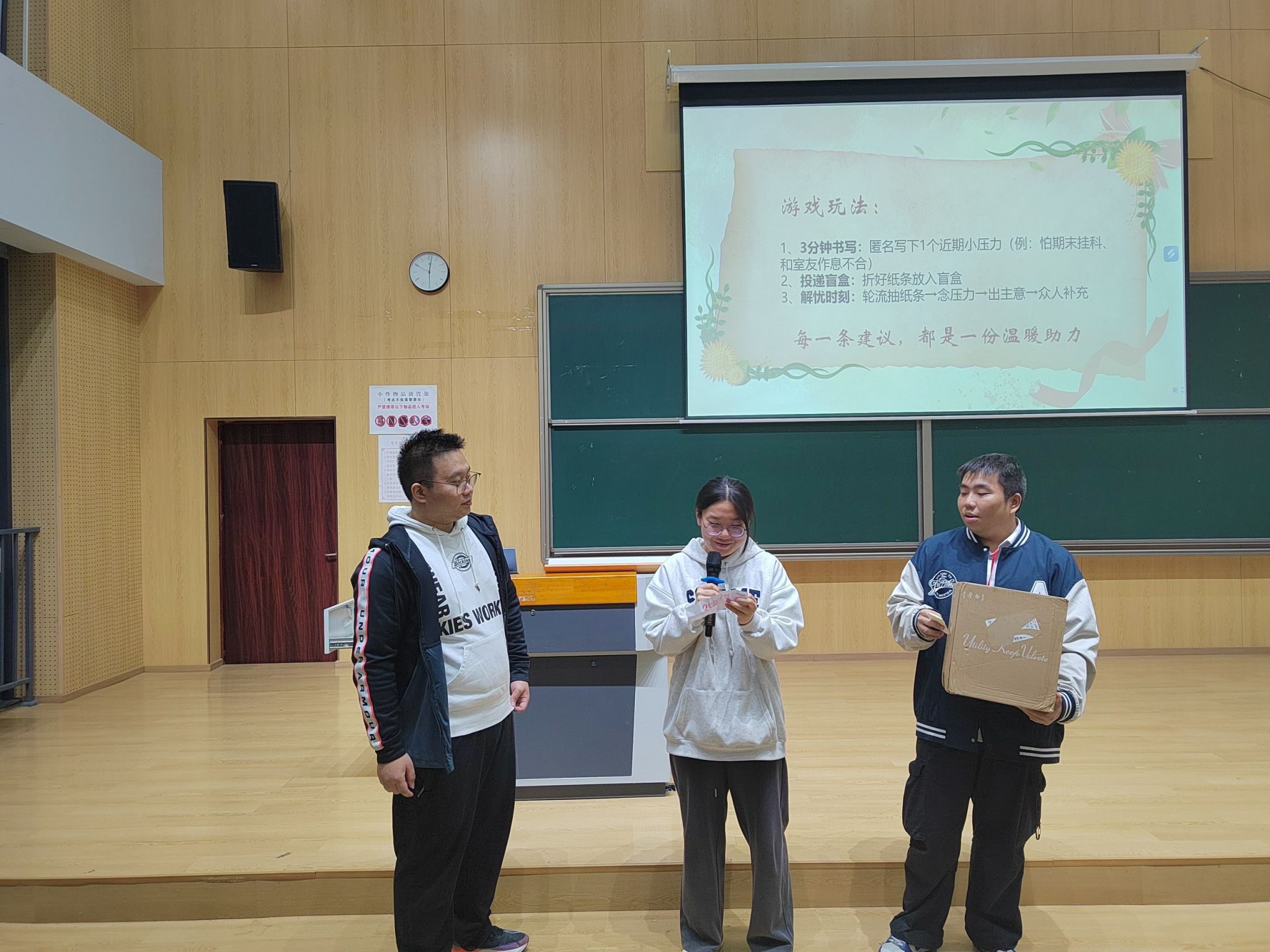 在“压力盲盒·解忧杂货店”环节中,同学们在纸条上匿名写下近期的小烦恼并投入盲盒。随后,大家随机抽取纸条,化身“解忧达人”为同学出谋划策,现场不时响起共鸣的笑声与暖心的回应,烦恼在集体智慧与善意中逐渐消解。在“夸夸接龙”环节,同学们敞开心扉,赞美了身边同学的闪光点,让善意流转,传递积极向上的正能量。