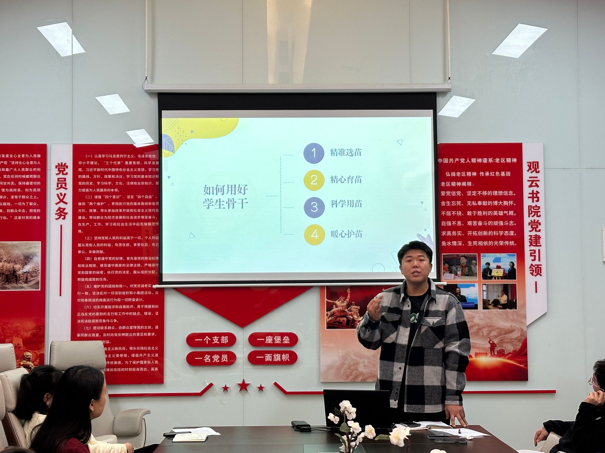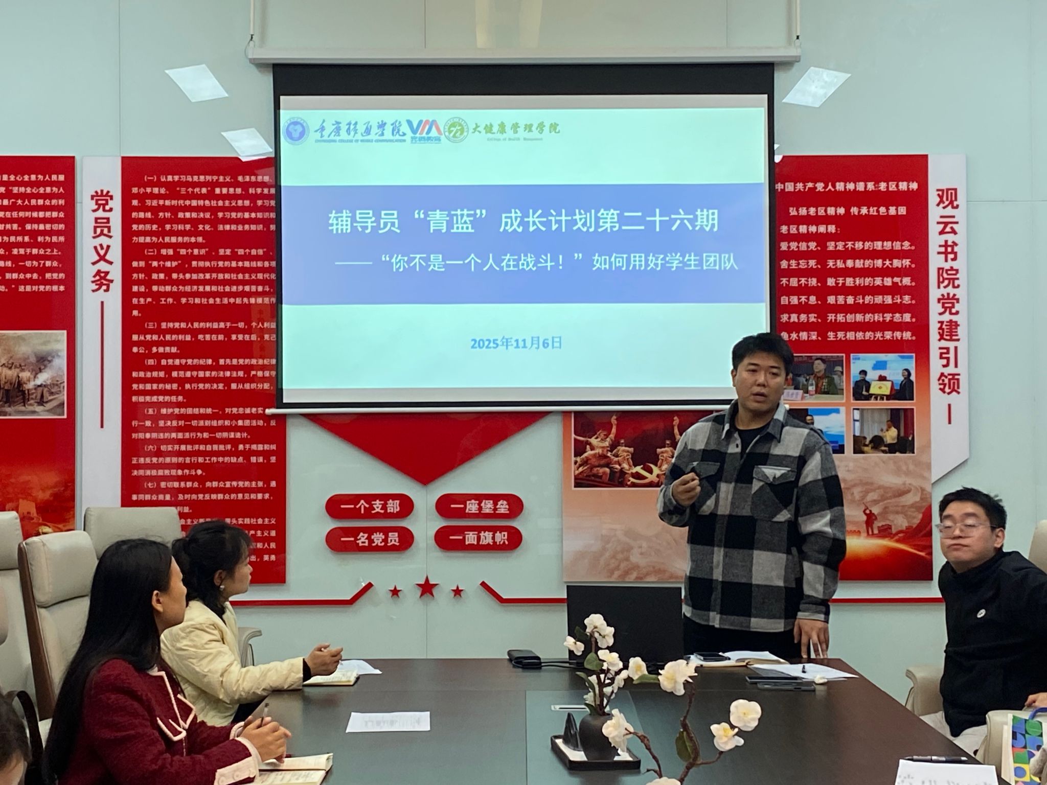 11月6日下午3时,大健康管理学院辅导员“青蓝”成长计划第25期在观云书院小雪会议室如期举行。本期活动主题为“你不是一个人在战斗!”,由孙泽宇老师主讲,聚焦“如何用好学生团队”这一核心议题,系统分享学生骨干培养与使用的实用方法。