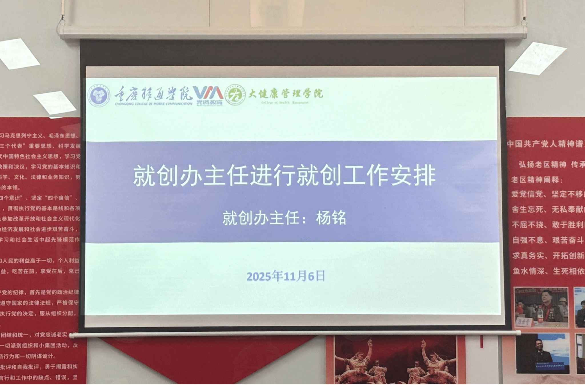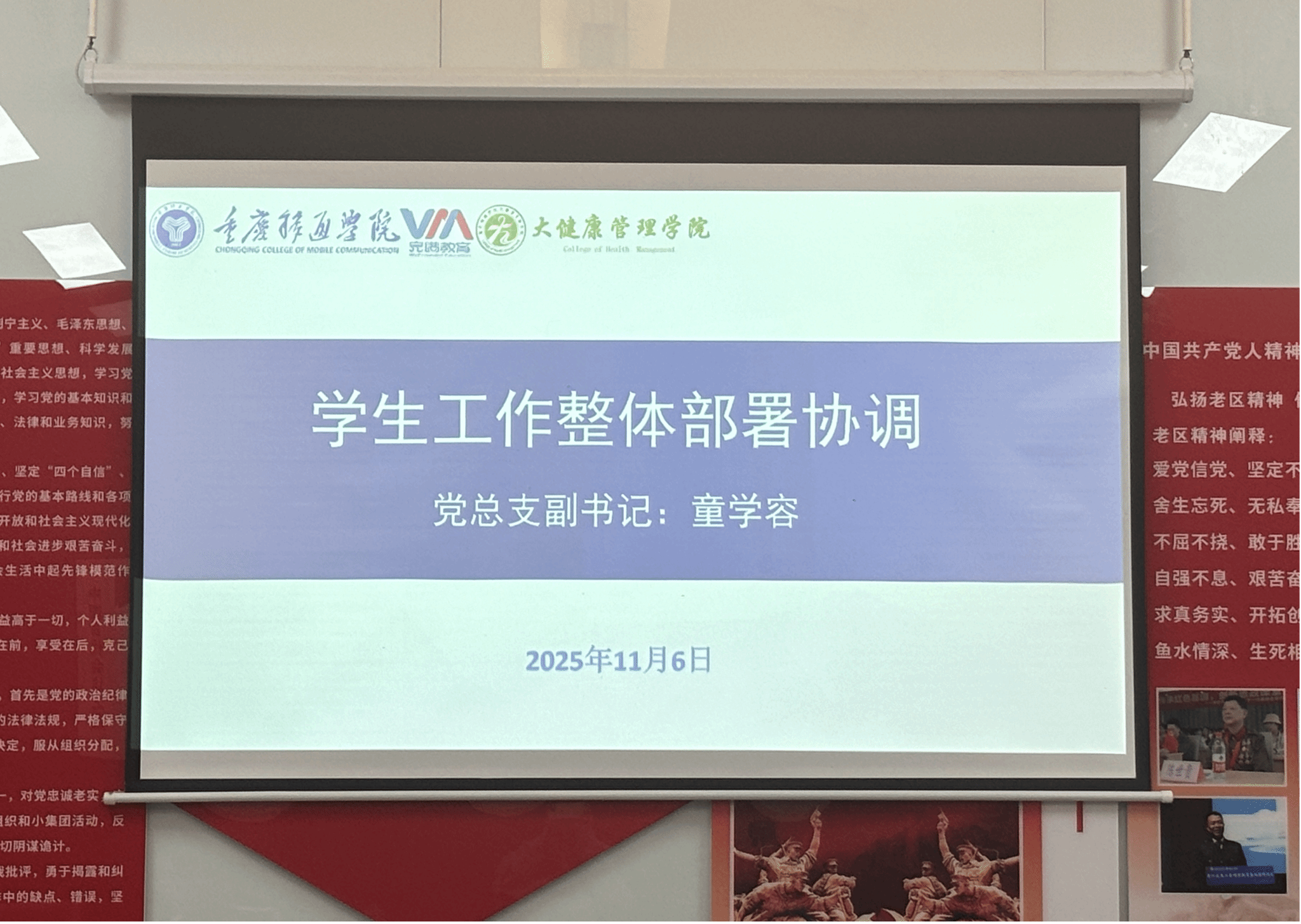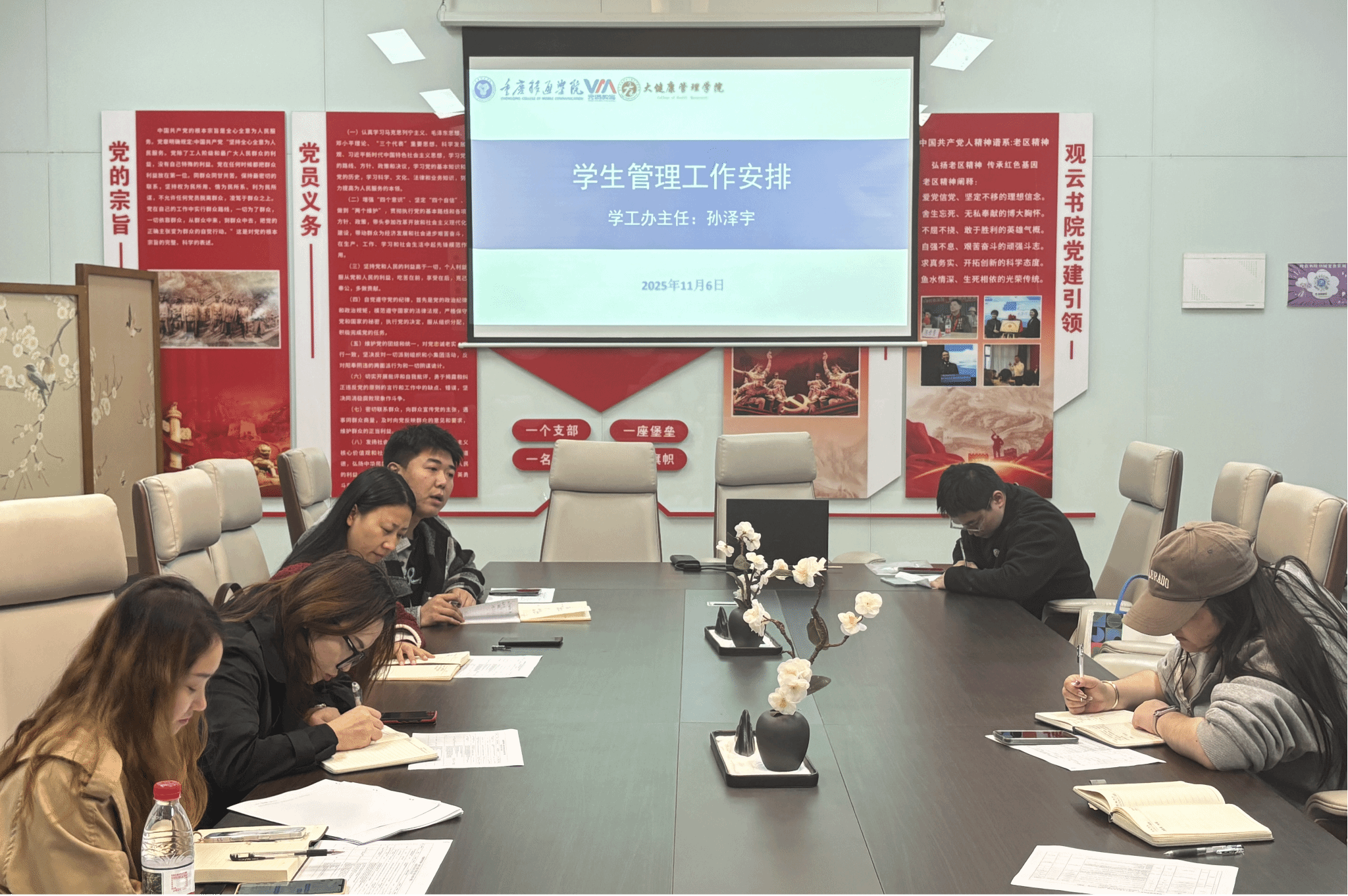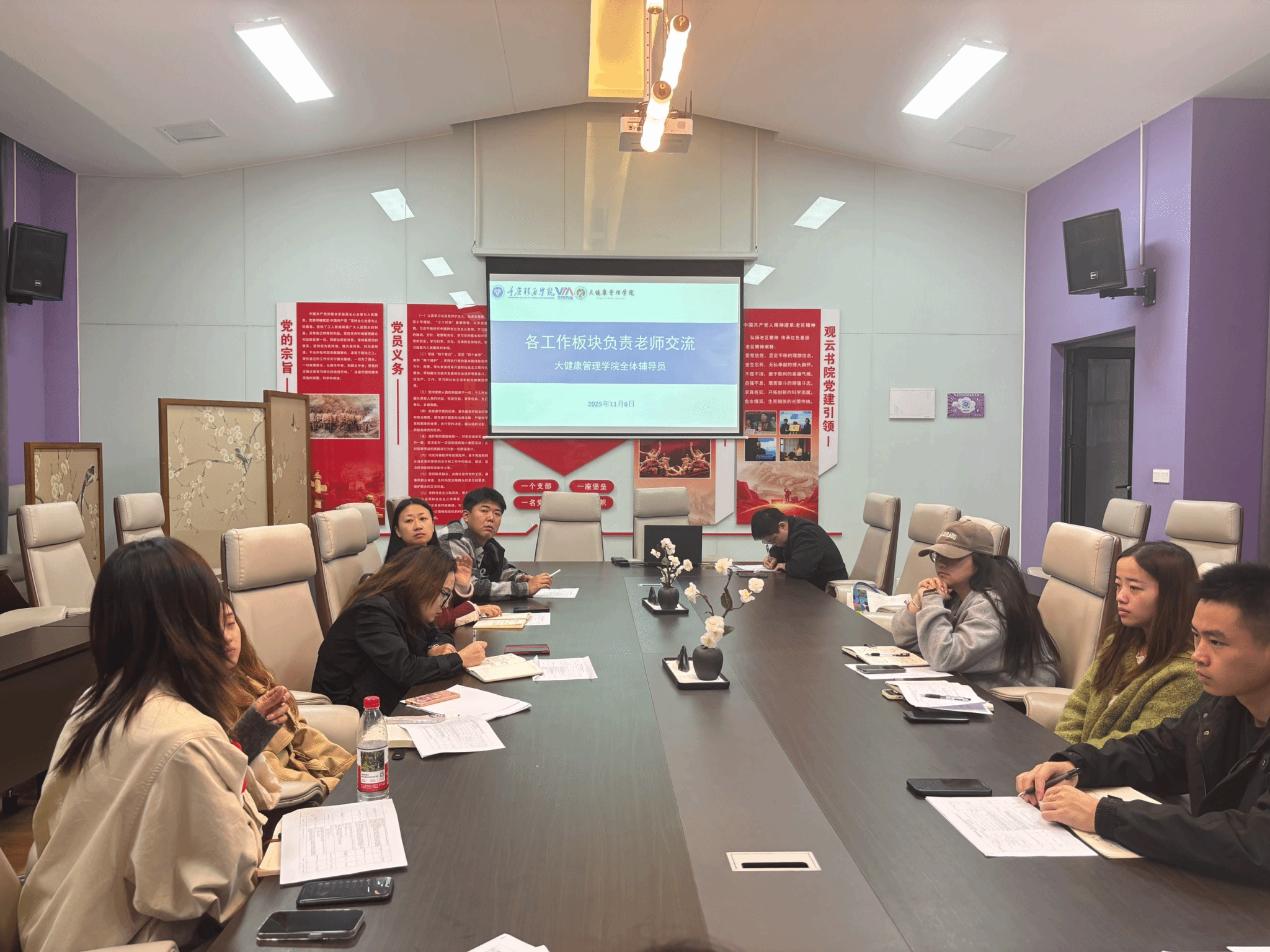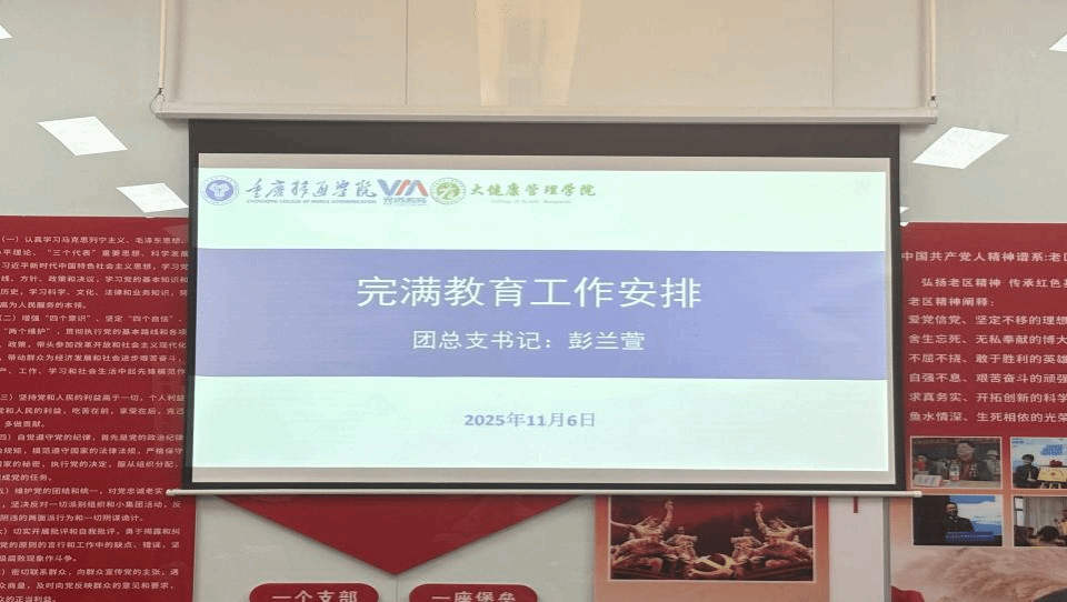 2025年11月6日,大健康管理学院在观云书院小雪会议室召开第十周完满学工例会。党总支副书记童学容、学工办主任孙泽宇、团总支书记彭兰萱、就创办主任杨铭及全体辅导员参会。