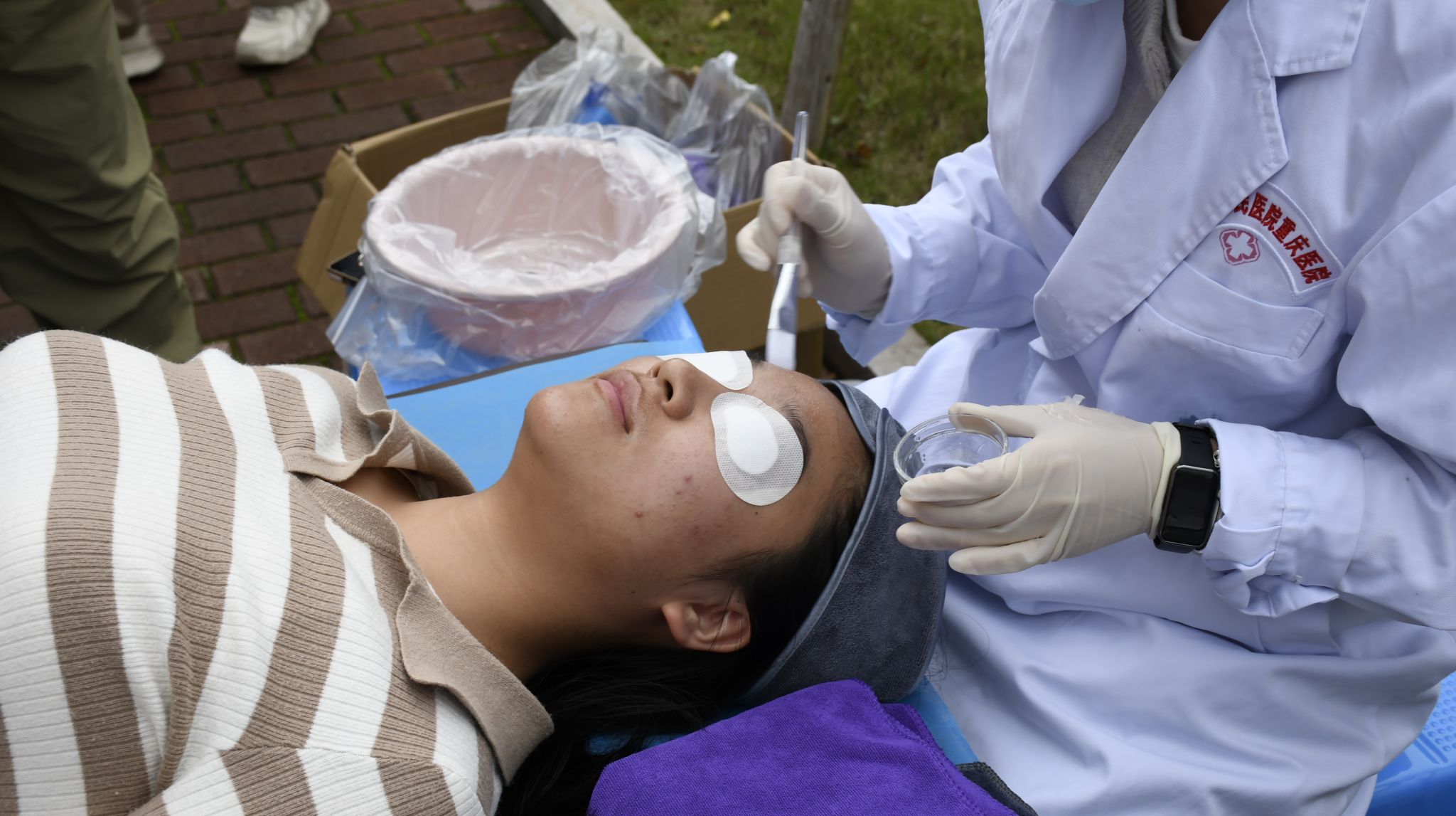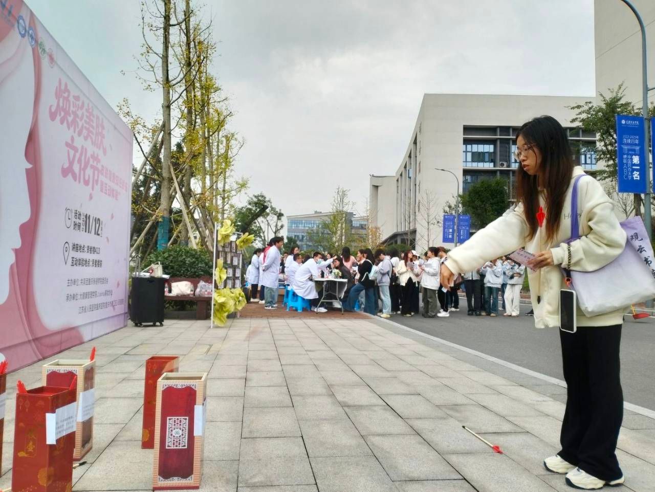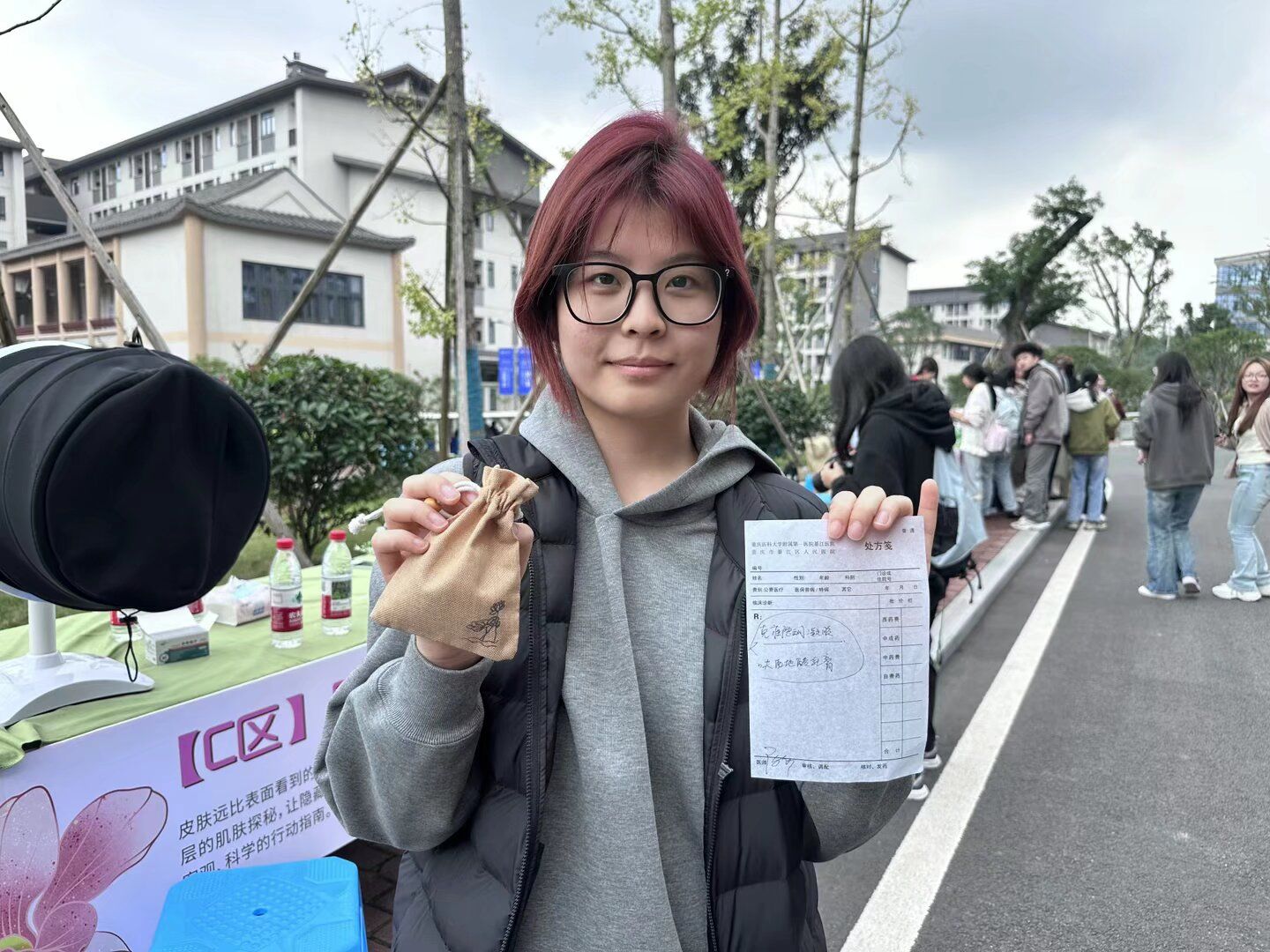 讲座结束后,互动体验在贤者楼下开启!学生凭集章卡参与各区域活动,集满4枚可兑换DIY香包,集满5枚还能额外获得按摩体验与护肤小样。现场特别设置了专家面诊区,由资深皮肤专家坐镇,为同学们提供一对一的专业咨询,针对不同肌肤问题,细致分析皮肤状况,并提供个性化的修复治疗与就诊指导,帮助大家真正学会如何科学护肤、养肤,告别皮肤困扰,焕发自信光彩!
