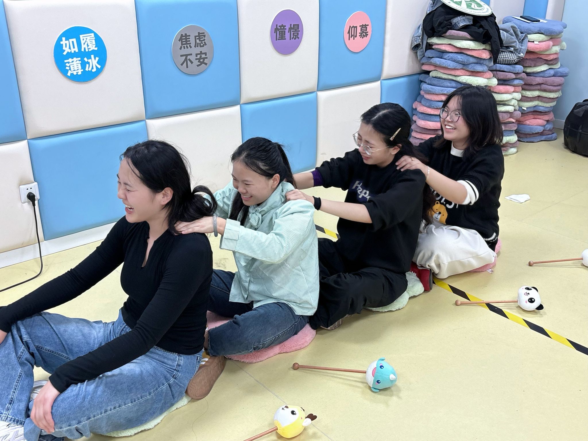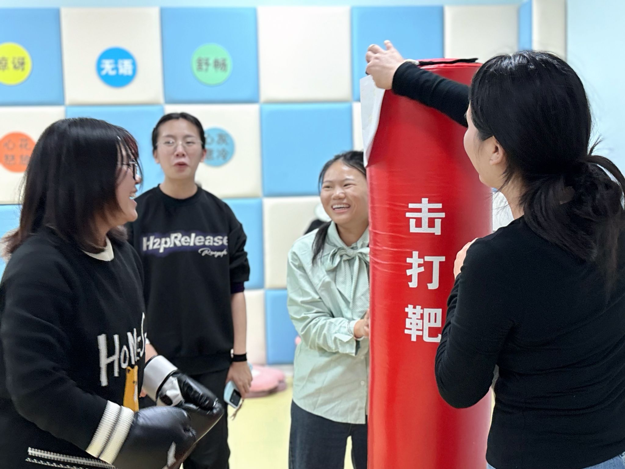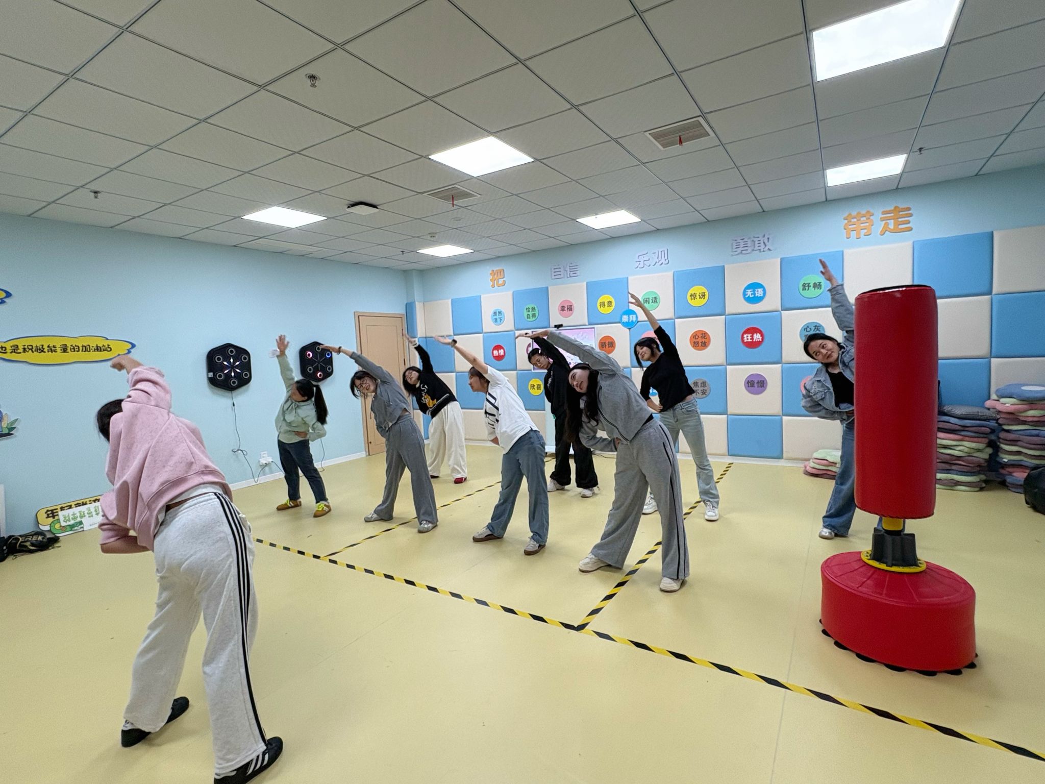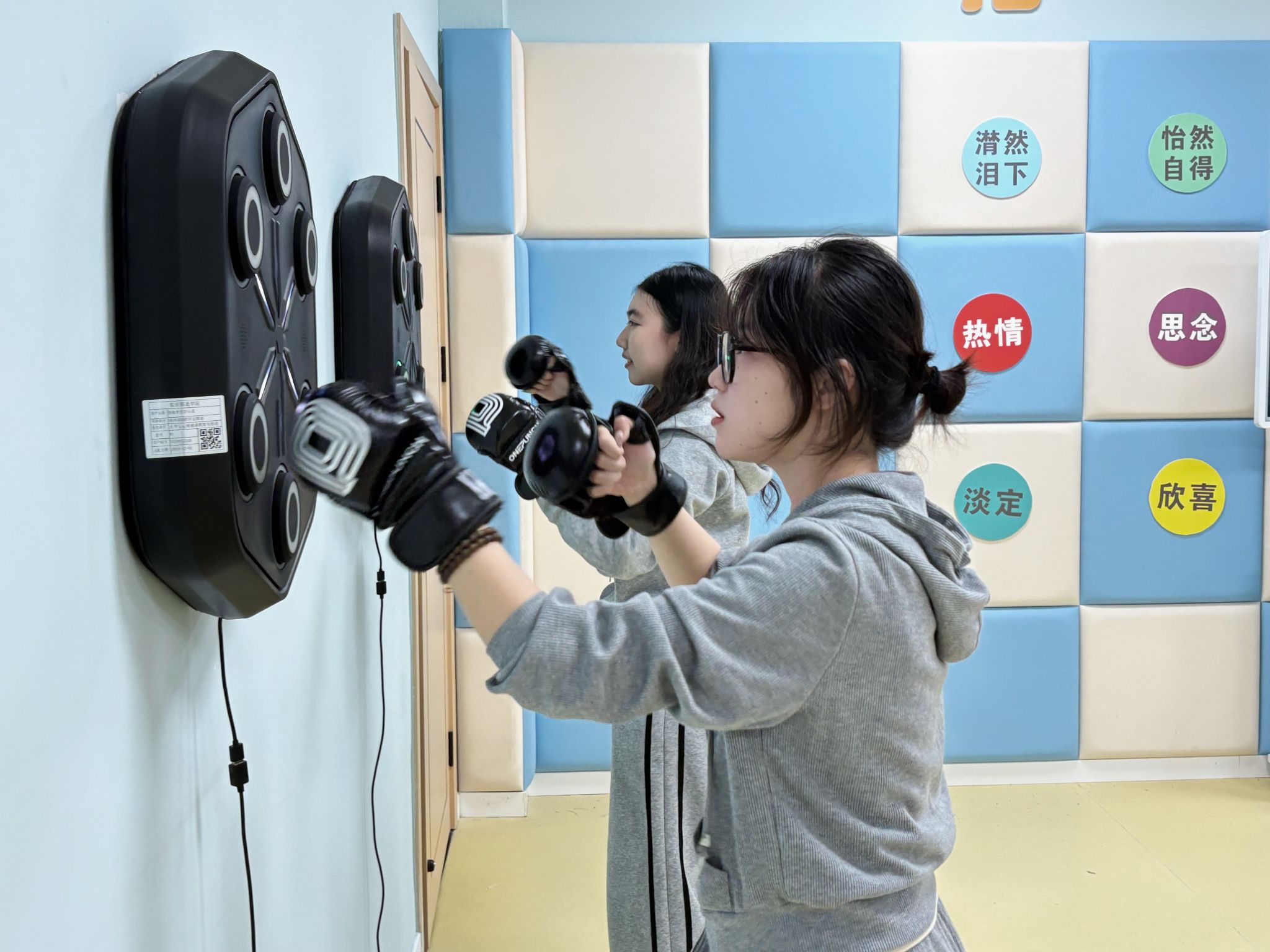 活动在国家二级羽毛球运动员周星彤同学的带领下火热开场。随后,同学们在功能室内自由体验击打宣泄仪、心灵唱吧、音乐拳击仪等专业设备,通过科学的运动与呐喊,将积累的紧张情绪转化为汗水与歌声,进行了初步的情绪释放。