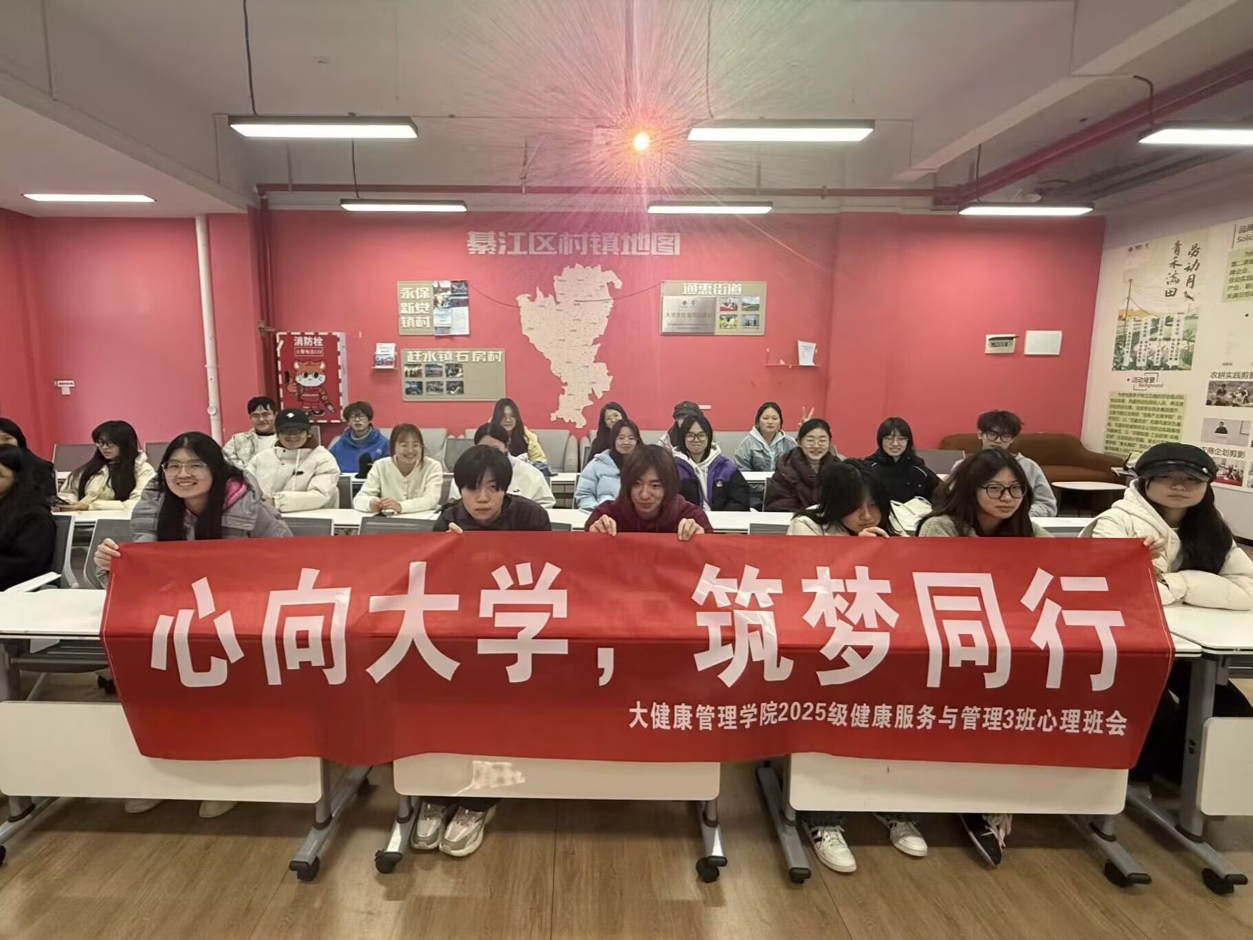 为帮助新生快速融入大学环境,2025级健康服务与管理3班于2025年11月18日14:00-16:00在玉棠书院扎推朋辈空间举办了以“心向大学,筑梦同行”为主题的心理班会。