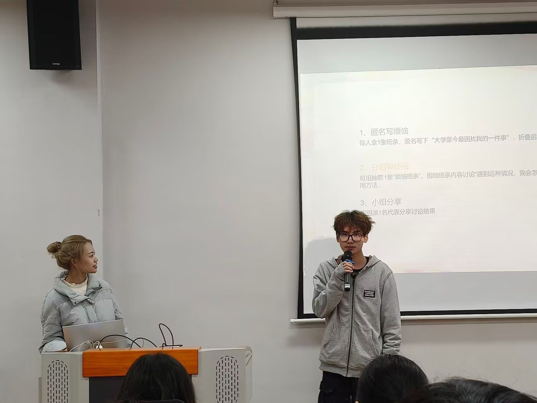 核心环节“我的小烦恼”堪称班会最大亮点。同学们拿起便利贴,匿名写下入学以来的困惑。随后,各小组随机抽取纸条,梳理出实用的应对技巧,让大家在交流中收获了破解心理难题的具体方法。