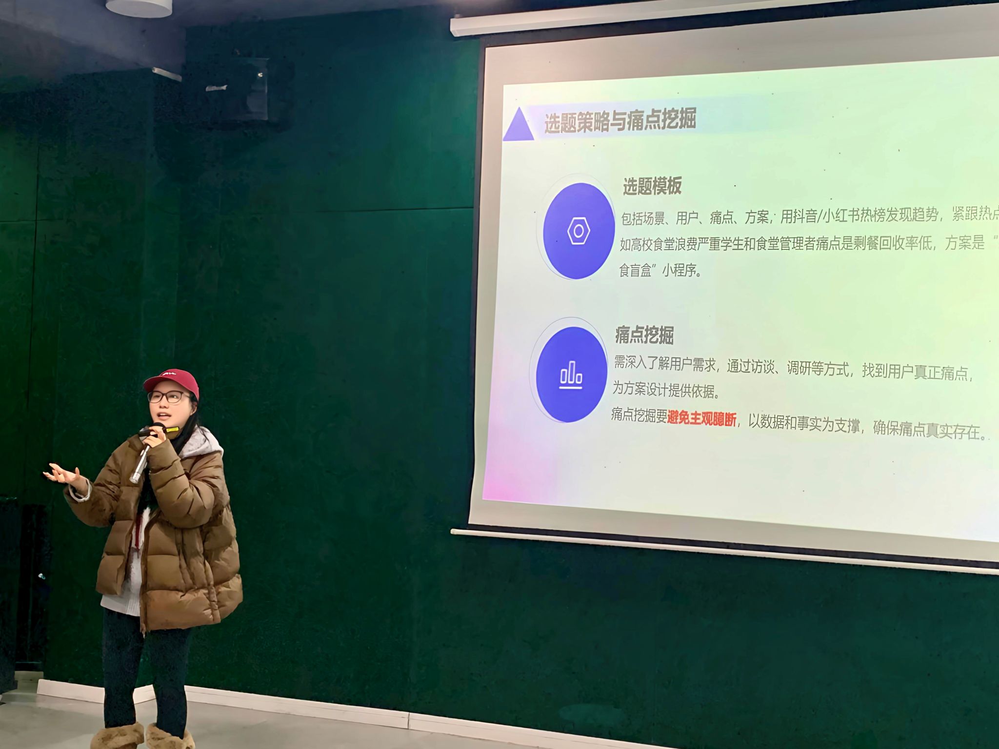 培训开篇,陈老师从赛事认知角度,解析了综合类与垂直类赛事的差异及定位,帮助学生理清选赛逻辑,再结合案例指导选题策略,引导学生挖掘需求痛点、设计差异化创新项目,解决备赛初期方向难题。