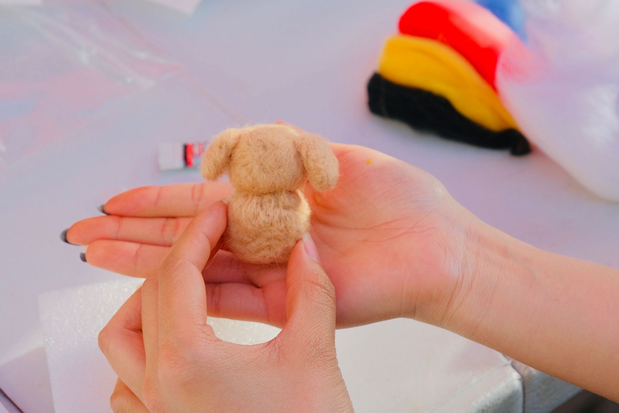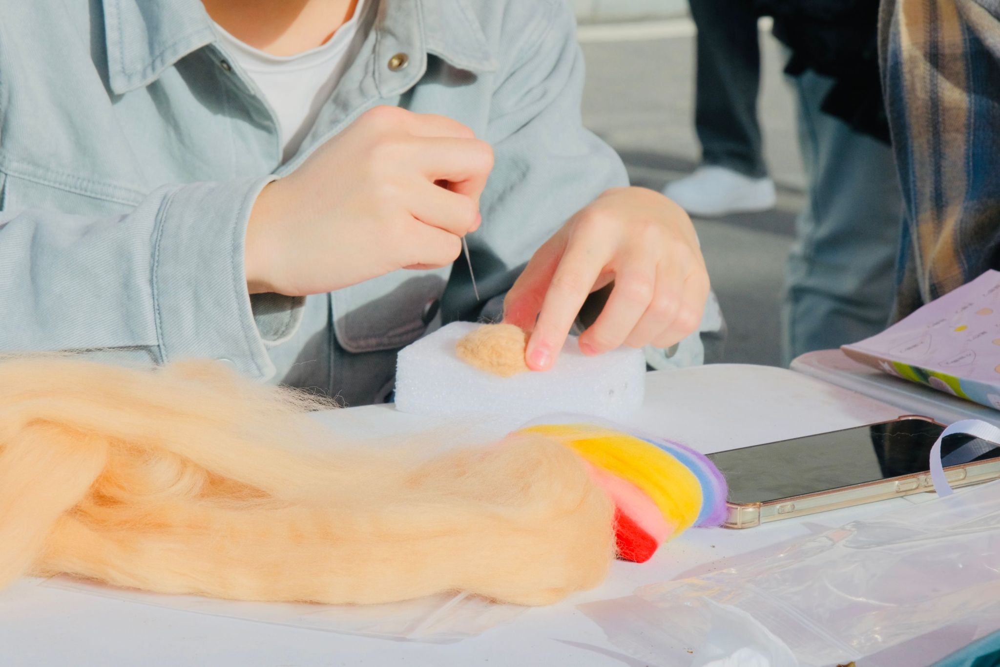 工作人员手持羊毛毡道具开始讲解规则:“台词猜猜乐来啦!说出对应电影名,就能抱走超萌羊毛毡奖品!”话音刚落,举手抢答声此起彼伏,答对的同学们接过绒绒奖品时,欢呼声接连不断!随后,工作人员向大家展示了羊毛毡制作的神奇过程。从一团团松散的羊毛,到逐渐在戳针下塑形,最终成为栩栩如生的作品,这一神奇转变让在场的同学们惊叹不已。工作人员还详细讲解了羊毛毡制作的基本技巧,包括羊毛的挑选、色彩搭配、戳针的使用方法等,为接下来的实践环节奠定了基础。