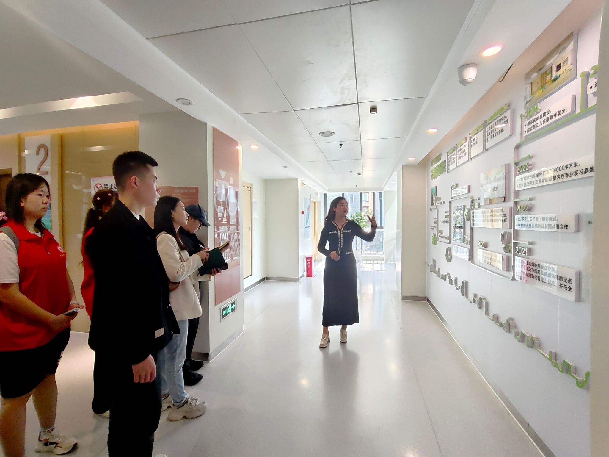 在院方陪同下,师生团队首先参观了医院康复诊疗中心、特色专科病房及创新康复服务示范区。重庆綦江綦名爱康康复医院党支部书记胡旋系统介绍了医院的发展历程、核心专科优势及“全周期+个性化”康复服务体系。作为康复医疗示范机构,重庆綦江綦名爱康康复医院在脑卒中后遗症康复、残障人士功能重建等领域积累了丰富经验,其“医康护一体化”模式与特殊群体精准照护实践令师生深受启发。胡书记表示:“期待通过校企联动,将临床经验转化为育人资源,助力健康服务人才专业化培养。”