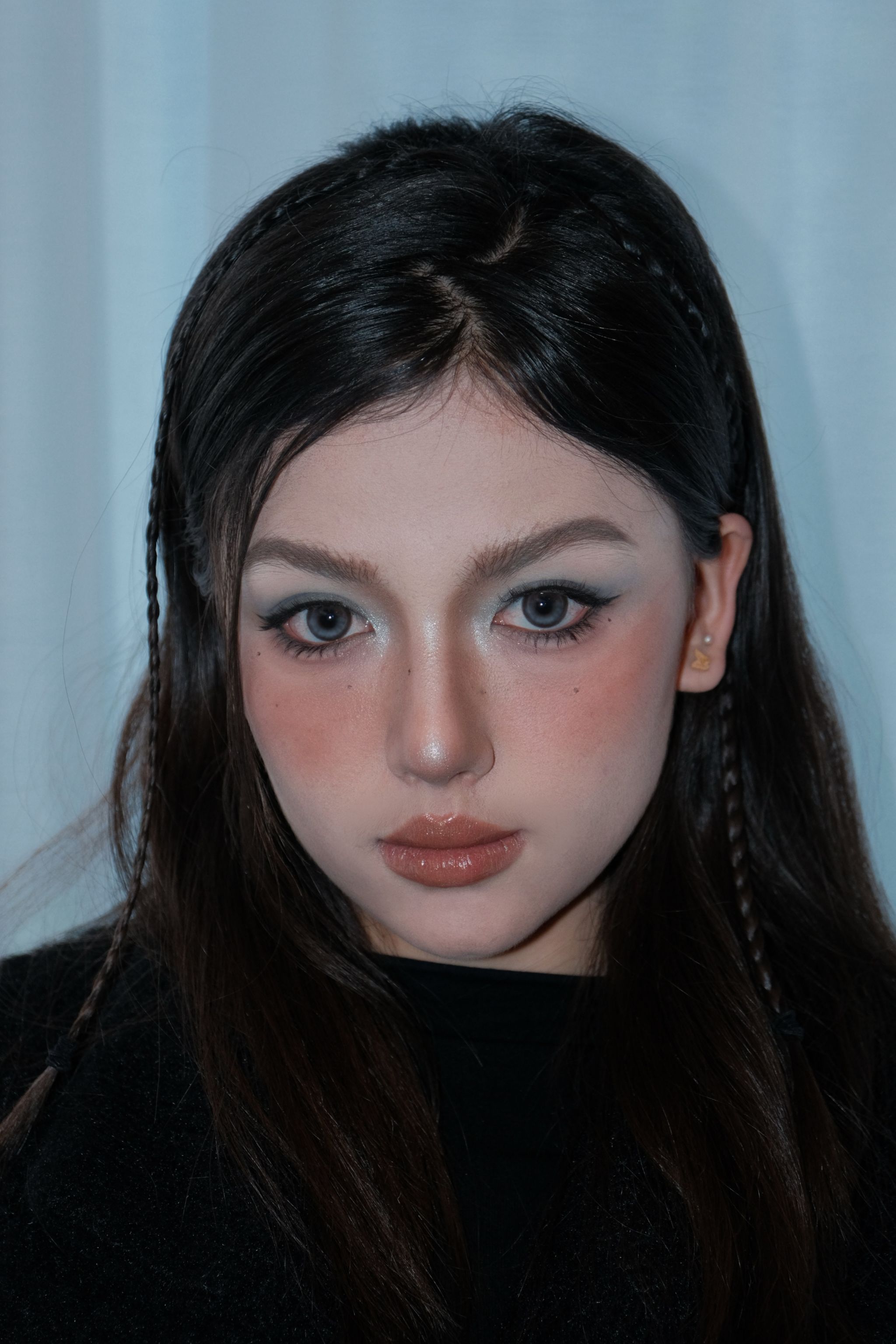霜粉色眼影层层晕染出蓬松云朵感,银闪如柳絮飘落在眼尾,灰瞳藏着初融的春水,哑光桃唇轻启似欲说还休,脸颊与鼻尖花瓣是春天偷吻的印记。