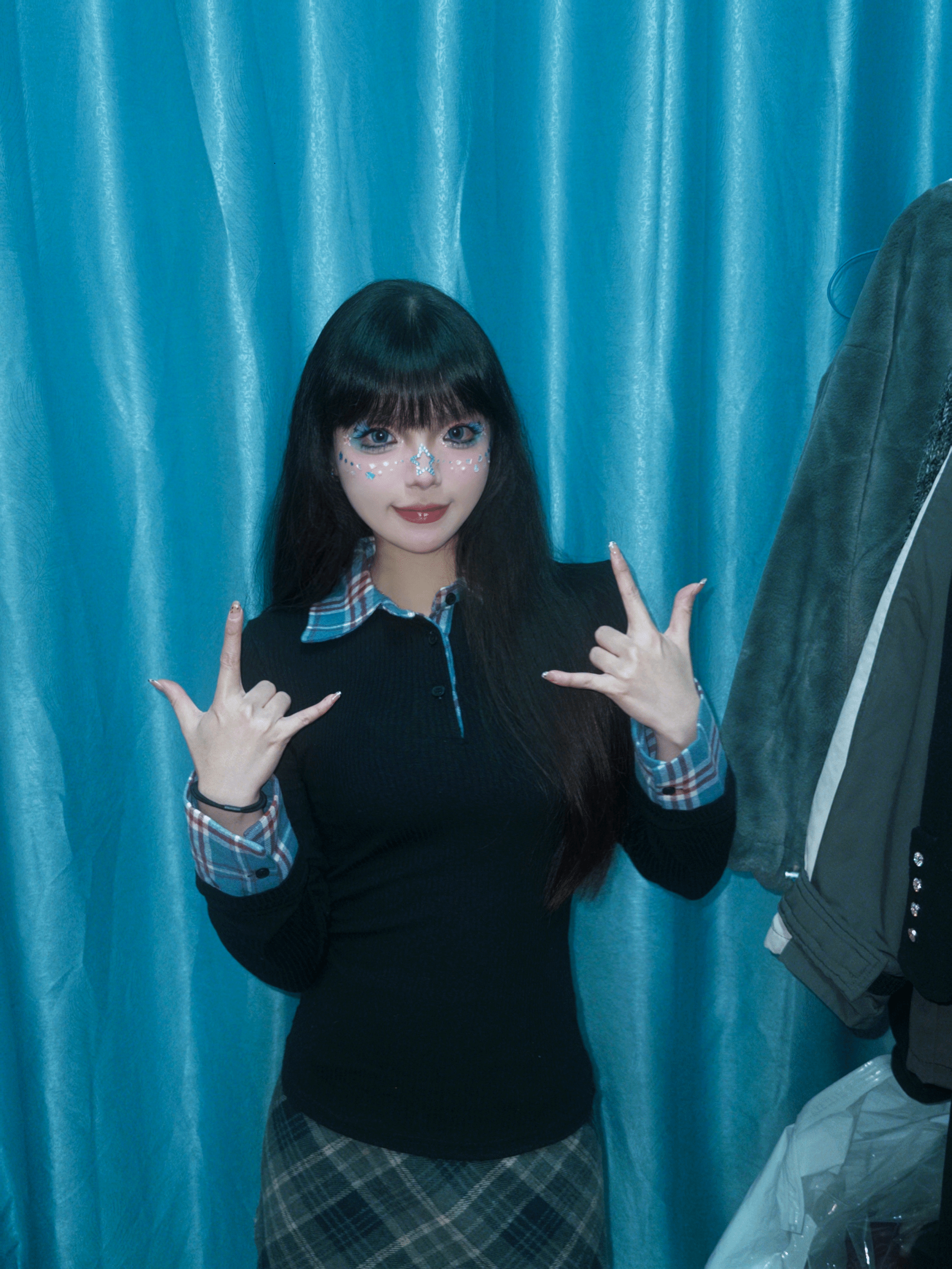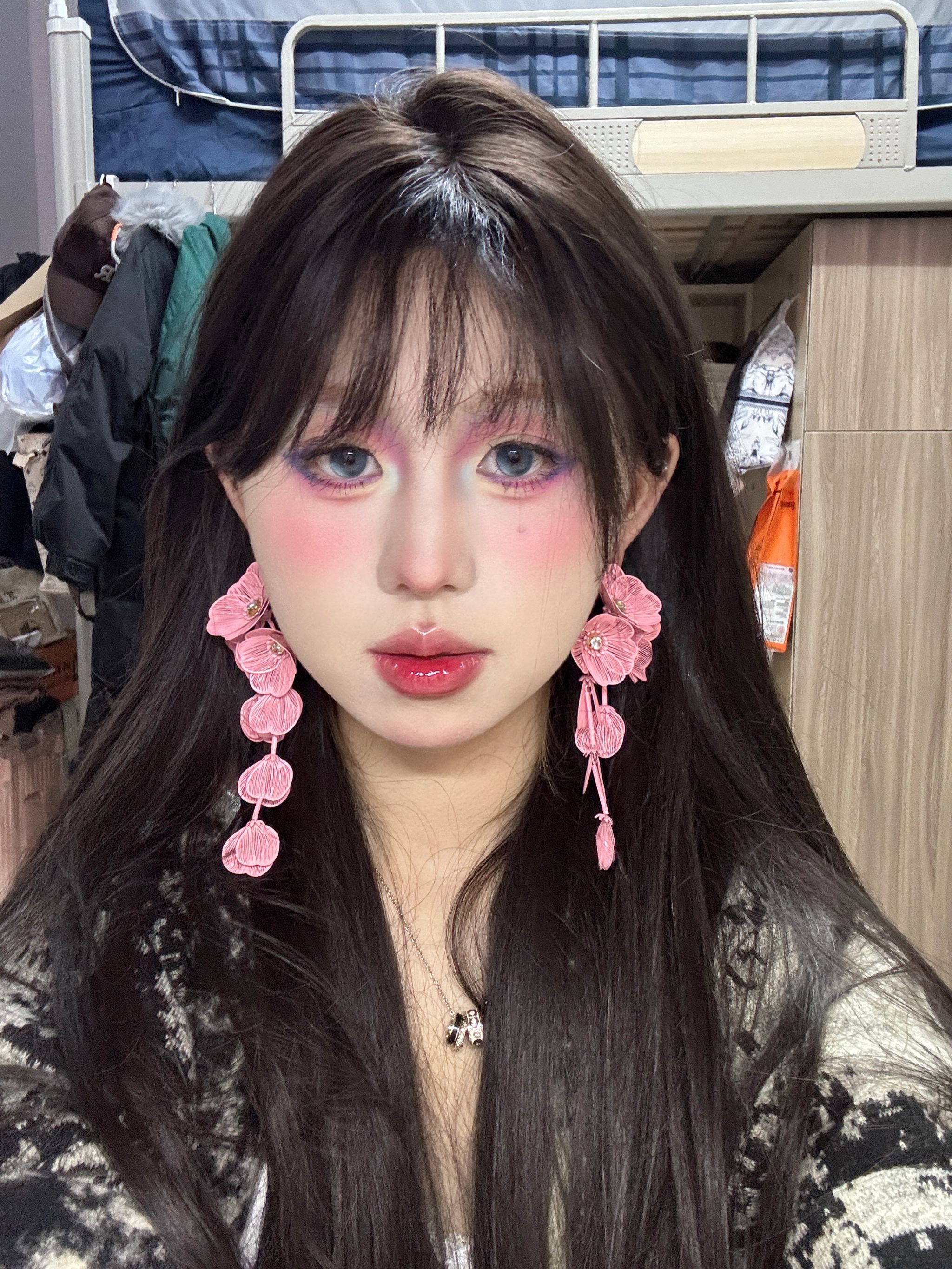 樱花色眼影在眼睑堆叠出蓬松质感,蓝紫细闪如琉璃碎片坠入桃腮,粉眉似沾着露水的花蕊,蓝莓美瞳流转着晨雾微光,水晶唇釉在阳光下折射出彩虹光晕,恰似被春风吻过的樱花琉璃盏。