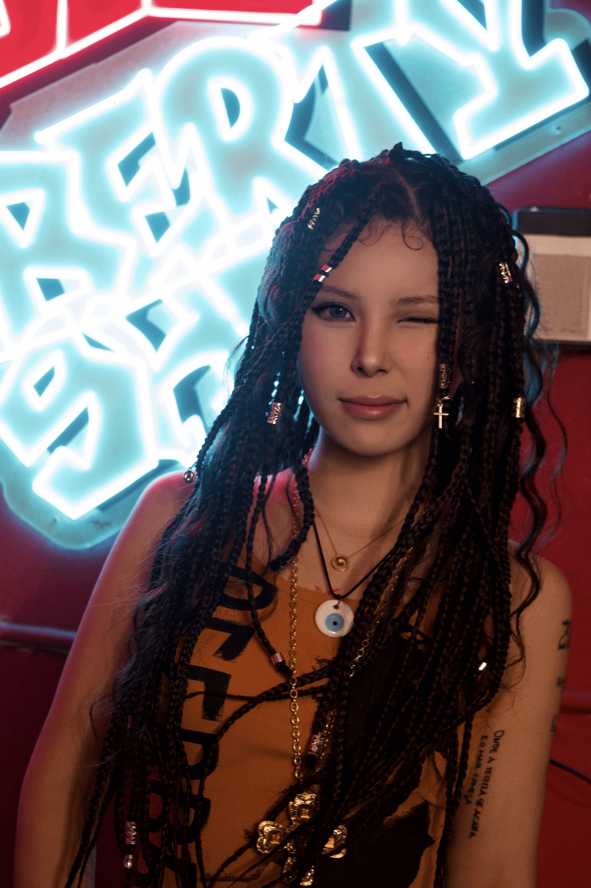 蜜棕肌底铺陈着日晒图腾,野生眉峰划破琥珀色黄昏,冰蓝美瞳倒映着部落篝火,银饰点缀的脏辫垂落如金属瀑布,晒伤腮红间闪烁的细闪是沙粒对烈日的回应。