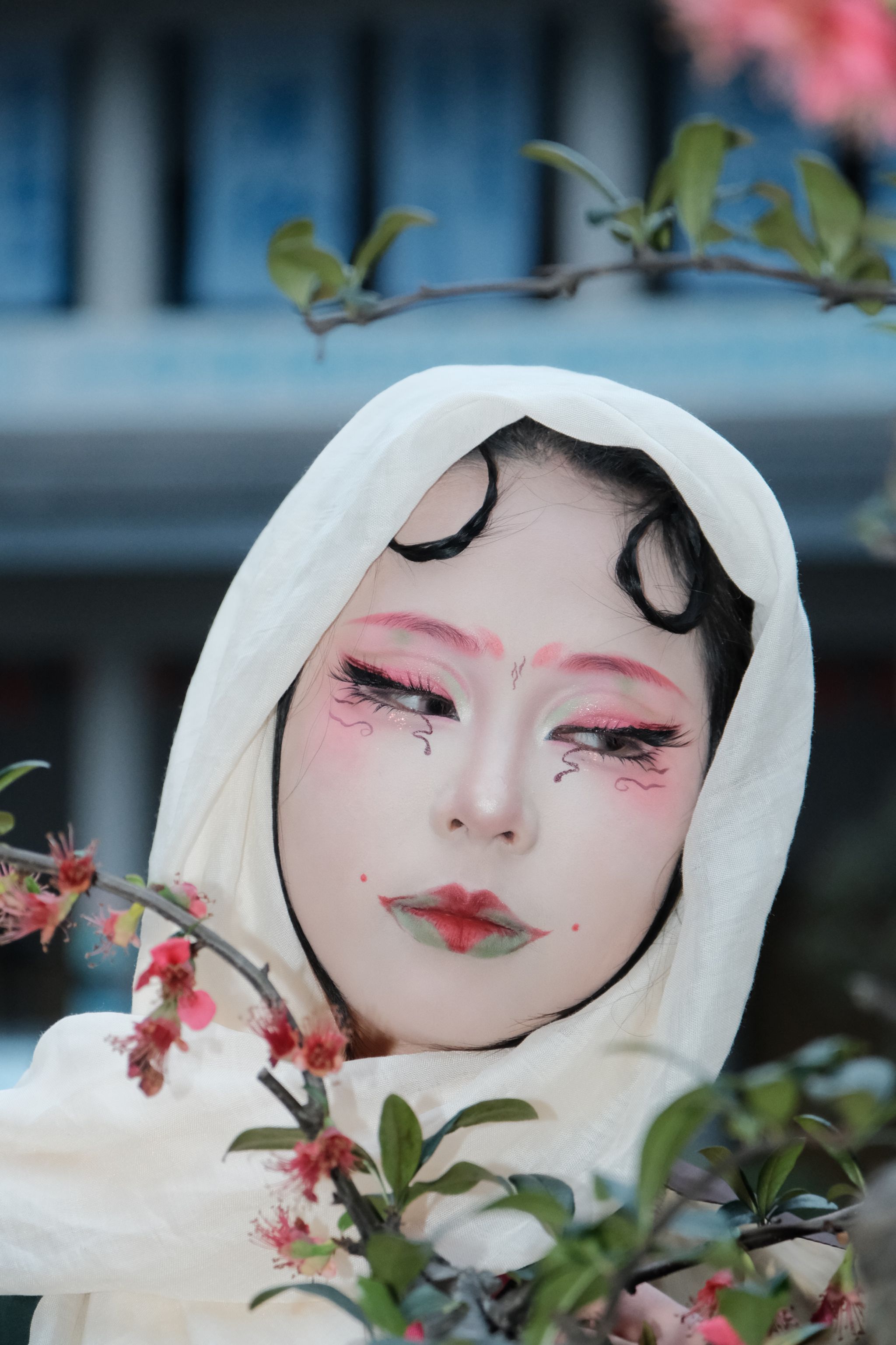 桃粉眼影在眼睑洇开桃花瘴,褐色眼线勾出惊鸿一瞥的尾梢,眼下纹路似水墨晕染,蝶翼般的睫毛颤动时,绿纹朱唇轻启,颊边朱砂痣在眼波流转间化为戏台上的水袖残影。