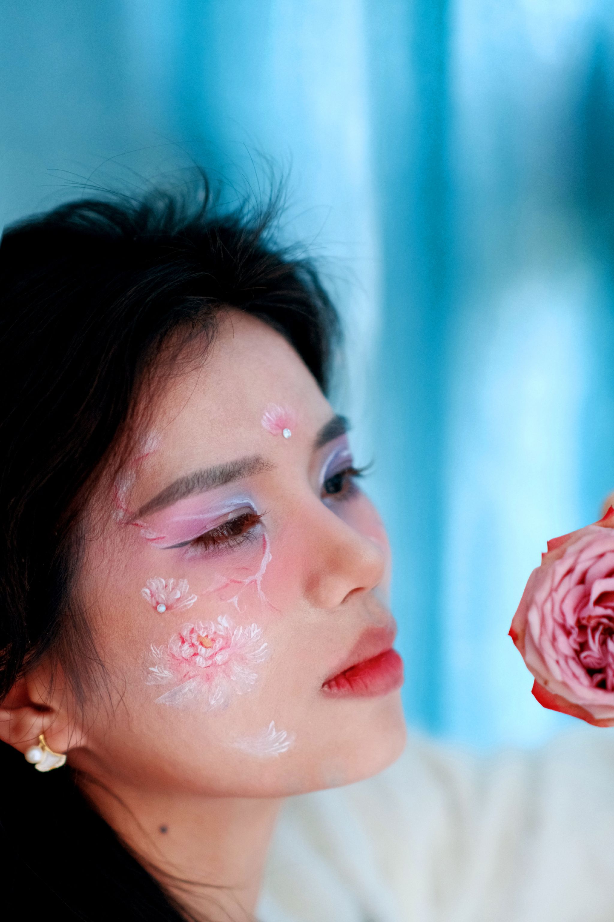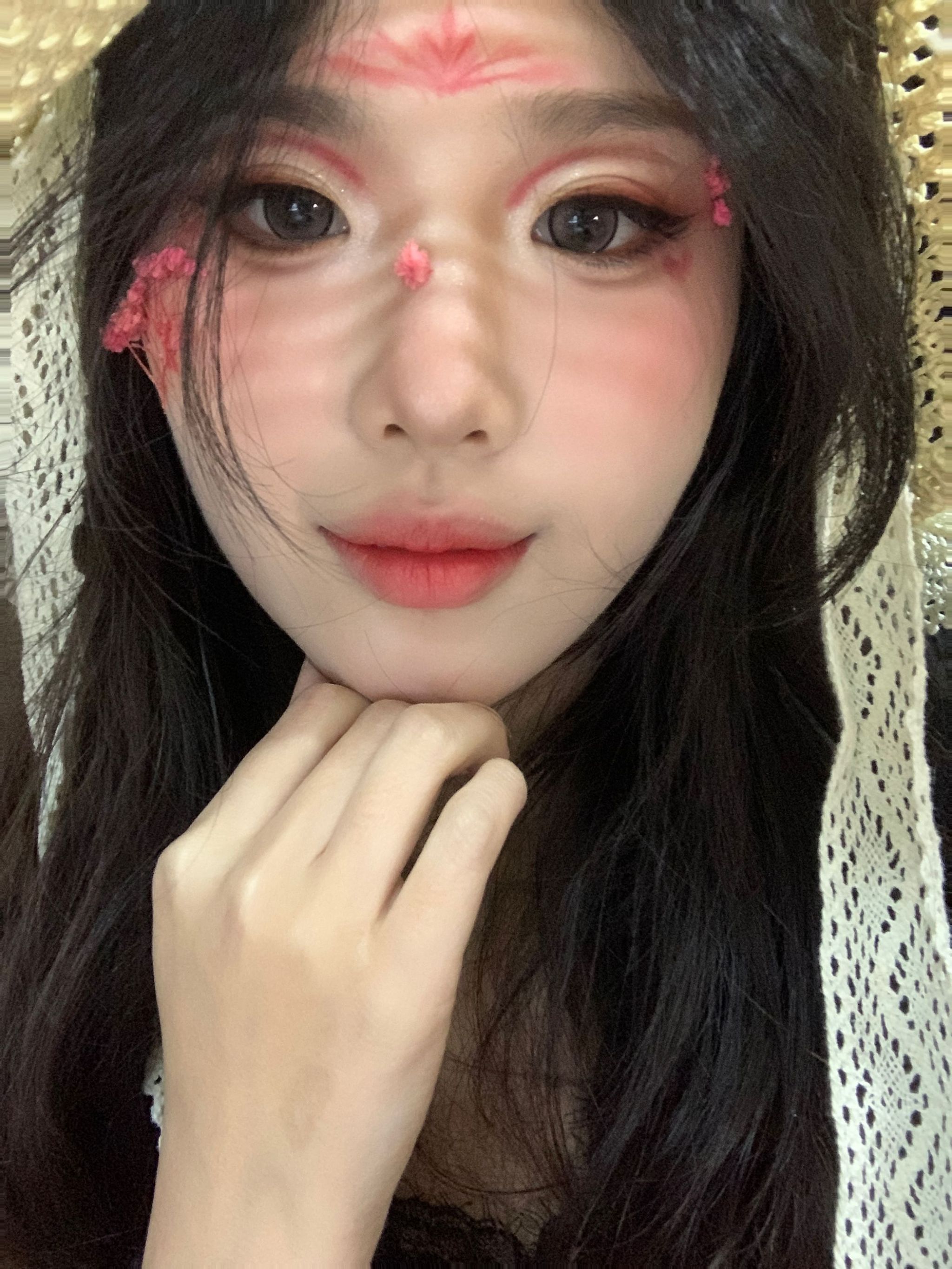 粉白花瓣在眉骨绽放,眉心朱砂莲与珊瑚腮红相映成趣,雾面唇釉如凝结的晨露,整幅妆容似水墨画中亭亭玉立的采莲女。