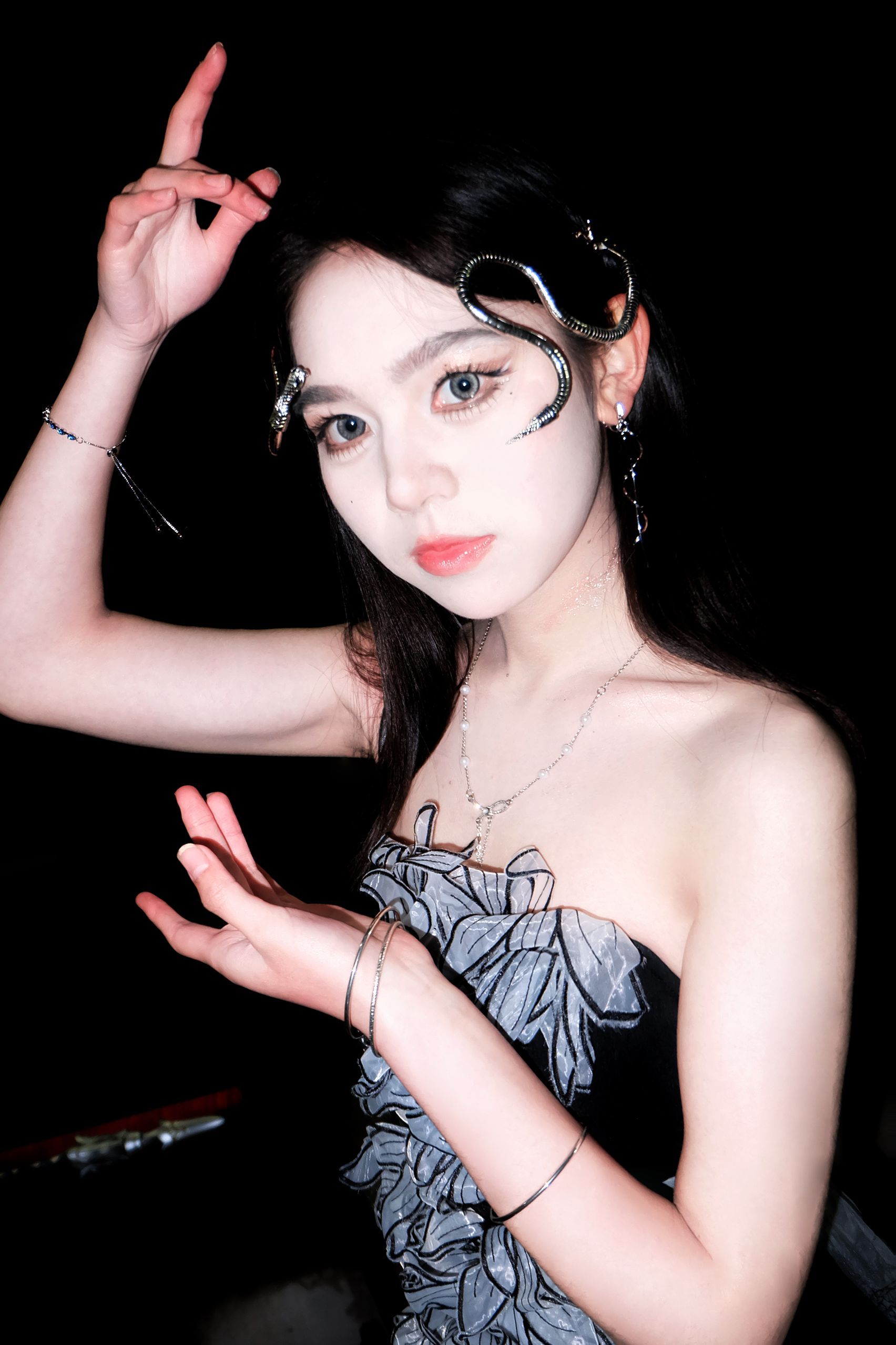 银鳞头饰如月光凝结的蛇信,冷调眼影晕染出蛇纹肌理,琥珀瞳仁流转着未眠的星辰,颈间银链与腕上蛇镯在光影中蜿蜒,整幅妆容似北欧神话里苏醒的霜雪灵蛇。