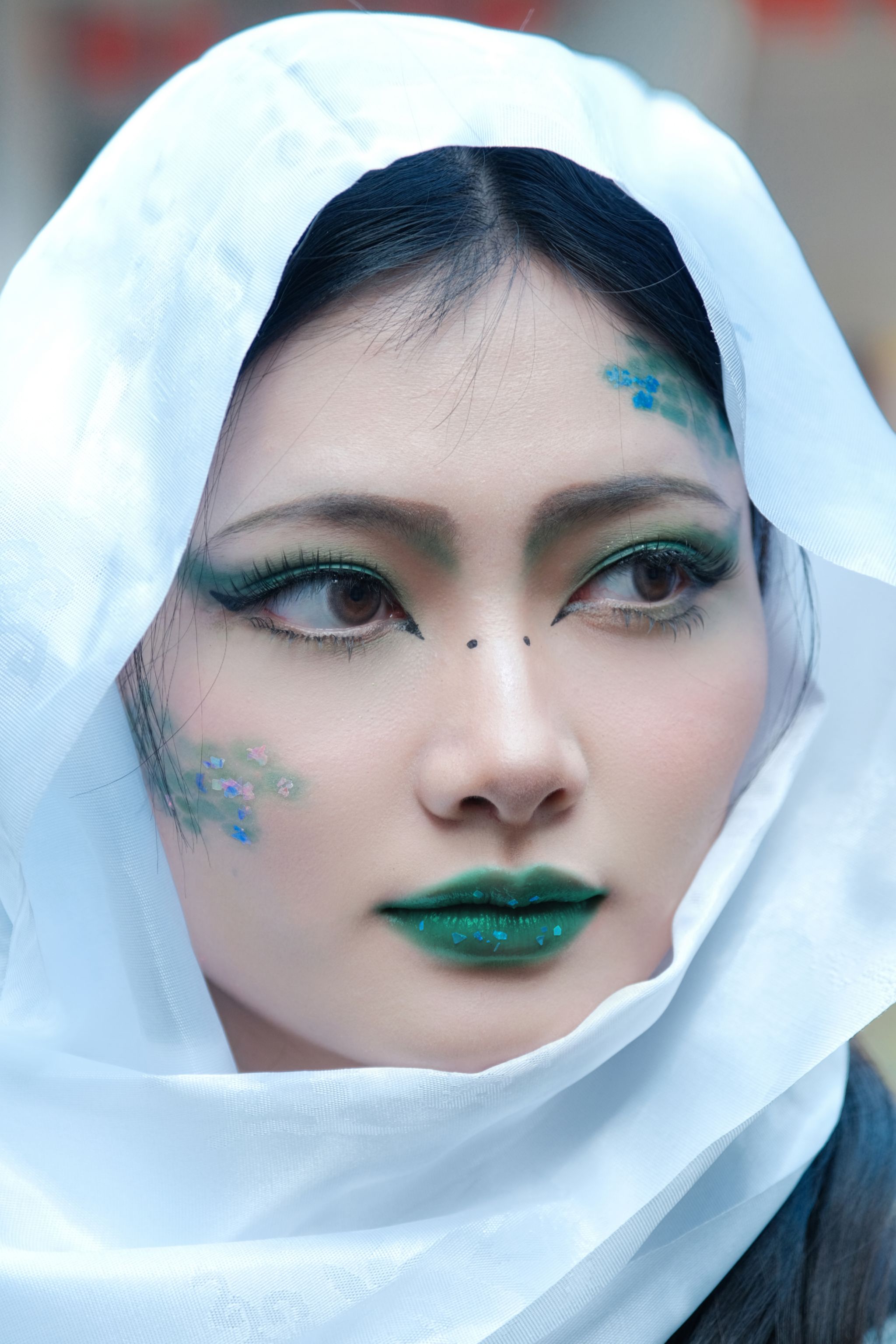 翠色蛇纹攀沿眼尾,鳞片闪片在颧骨碎成星芒,绿釉唇间游弋着石化的蛇信,眉心蛇瞳凝视着永恒的暮色,整幅妆容如活过来的希腊悲剧浮雕。