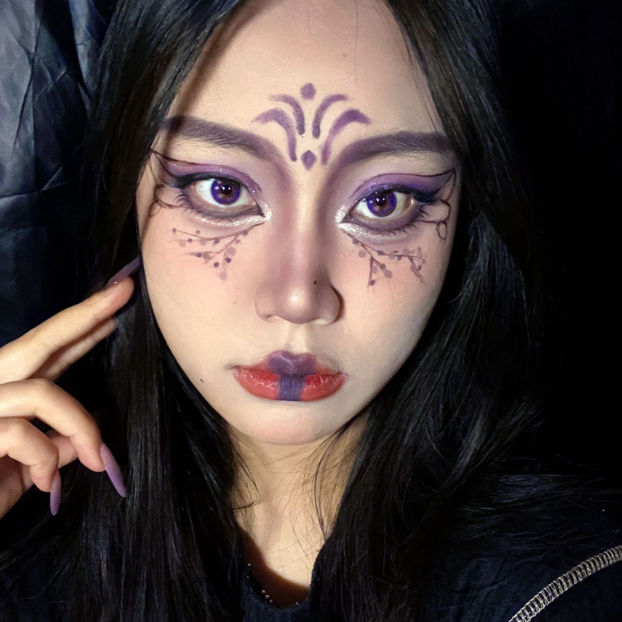 水墨质感的眼影在眼睑流淌,墨紫图腾沿颧骨绽放成曼陀罗,紫水晶眉峰挑起东方古韵,灰紫美瞳藏着未融的玄冰,唇心暗纹如古籍中褪色的符咒,整幅妆容似宣纸上晕开的紫微斗数。