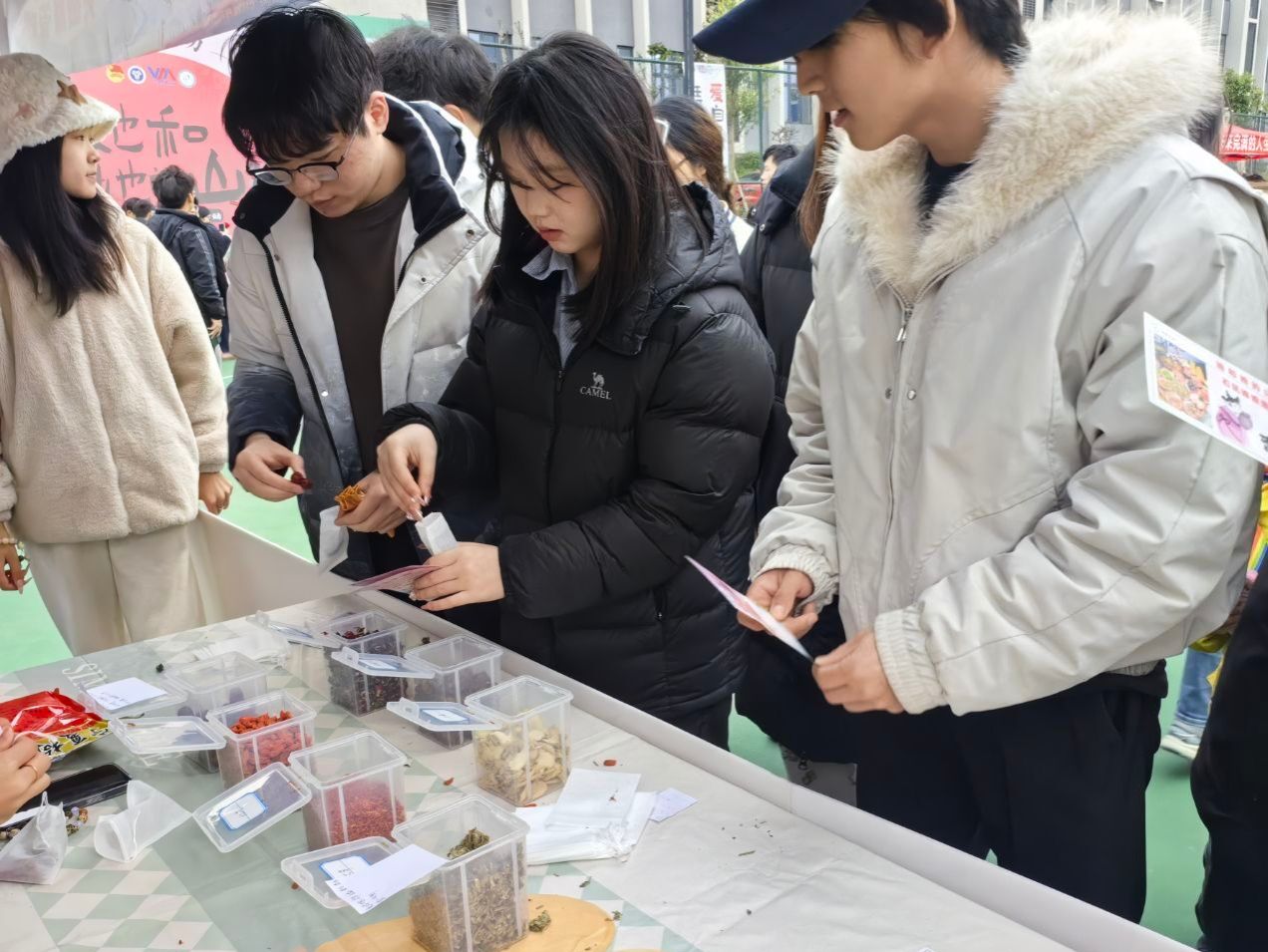 “芳沁茶语”活动区域茶香四溢,提供的暖宫茶、安神茶、补气茶等茶方,种类繁多,功效各异。同学们纷纷排起长队,亲自动手,从选料到制作,每一个步骤都充满期待,沉浸于传统养生文化的深入体验之中。