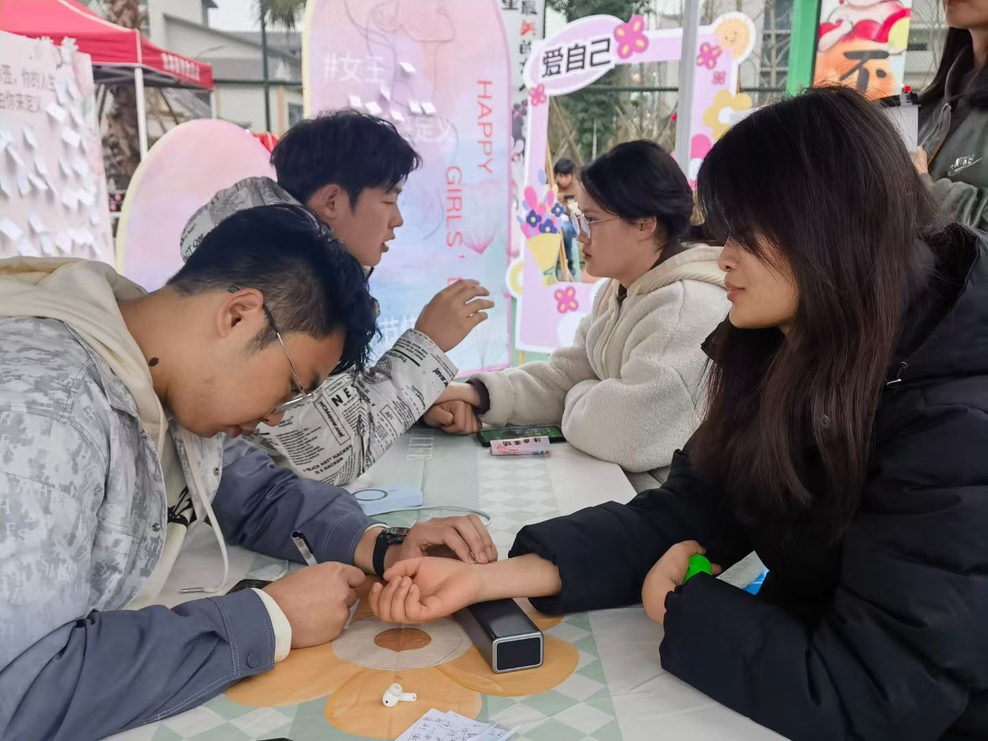 在贤者楼前篮球场上,体验活动丰富多彩,同学们热情高涨,积极参与其中。在“青衿问脉”环节,向日葵医护服务志愿服务专项支队的志愿者凭借扎实的专业知识,为同学们细心把脉,并依据个人情况,给出科学合理的建议,让同学们在互动中了解自身健康状态,感受中医文化的独特魅力。