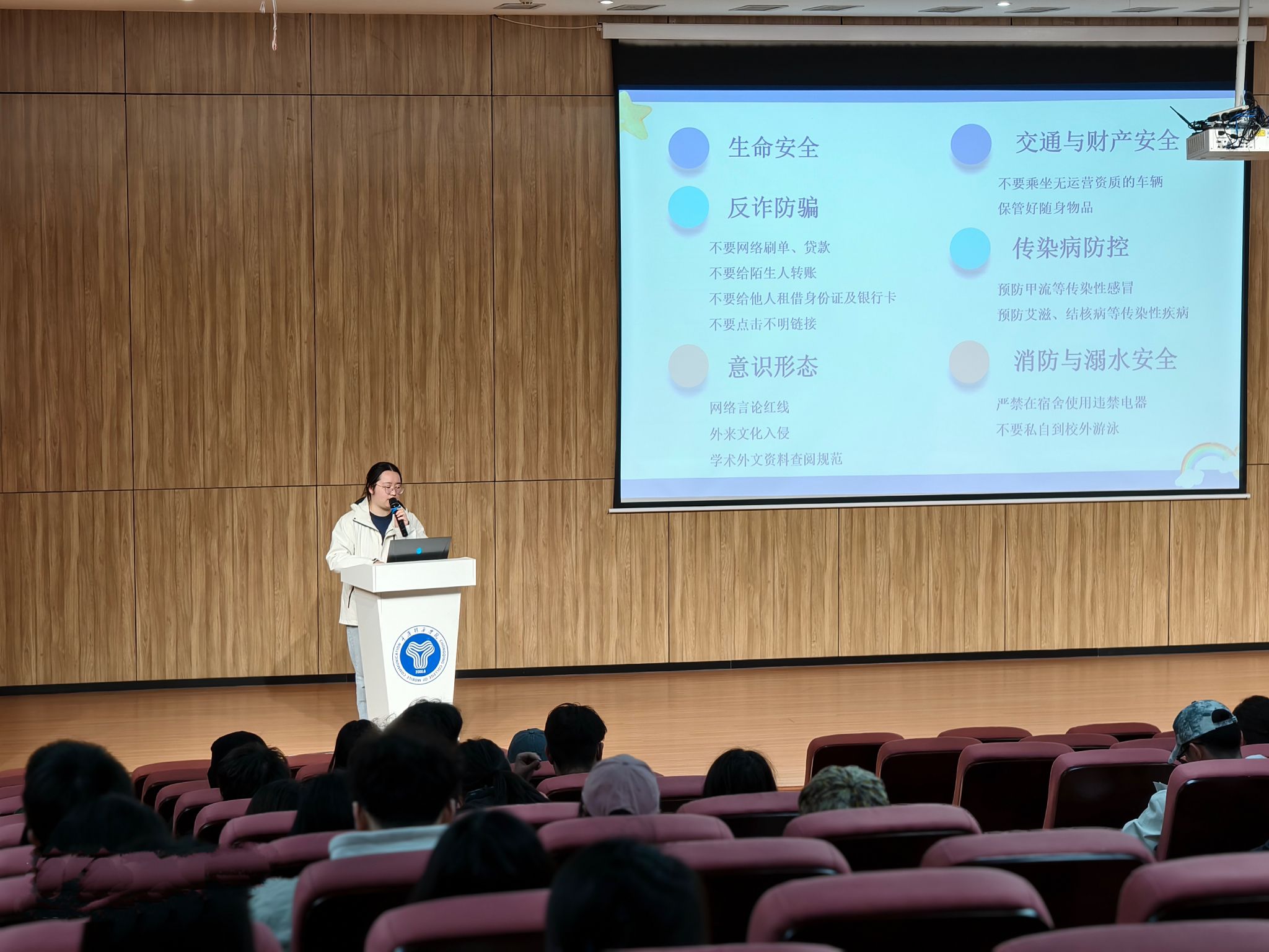 辅导员们还开展了全方位安全教育,重点涵盖六大安全领域:生命安全倡导珍视生命、强化自我保护;反诈防骗强调识别新型骗术,提醒谨防网络刷单、借贷陷阱,警惕信息泄露;意识形态安全要求树立正确三观,规范网络言行;交通与财产安全重申校内电动车禁行规定,提示选择正规交通工具并妥善保管财物;传染病防控提出加强个人卫生管理,重点防范甲流、艾滋病、肺结核等疾病;消防与防溺水教育普及应急逃生及水域避险技能。通过系统性安全知识讲解,旨在为全体学生构筑安全防护网,护航青年学子在健康和谐的校园环境中专注学业、全面发展。