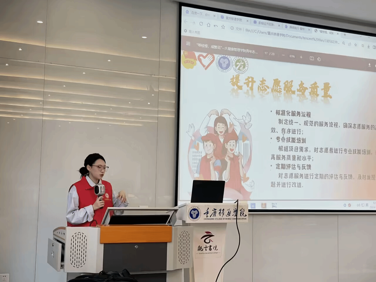 “青春虚度无所成,白首衔悲亦何及”,青年应珍惜时光,努力学习,不断提升自己的的能力和素质,实现自己的人生价值。培训现场气氛热烈,邹贤玉同学围绕项目与志愿服务、项目管理两个方面展开了深入浅出的讲解,详细强调了项目管理规范及需具备的能力。邹贤玉同学的讲解清晰明了,让同学们对志愿服务有了更深层次的认识,大家在聆听过程中仿佛看到自己投身于志愿服务活动中的身影,充满热情与活力,已迫不及待地想要投身到接下来的志愿服务活动中,去实现自我价值,进一步提升自己的能力。