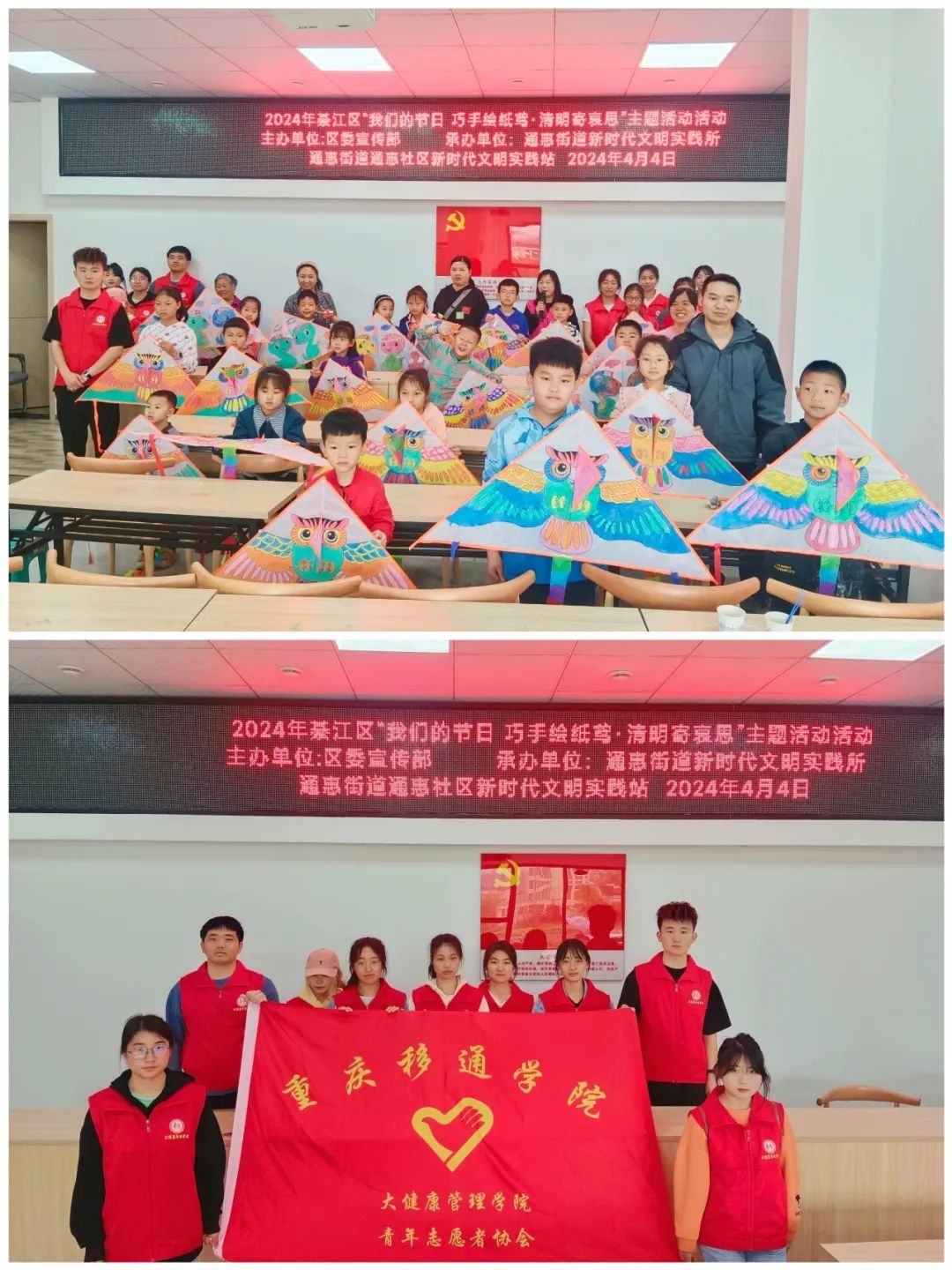“车声上路合,柳色东城翠。”以情绘纸鸢,以思寄春天。大健康管理学院于2024年4月4日上午九点前往通惠社区组织了清明节绘纸鸢活动,将志愿者们的奉献与爱心绘进纸鸢中,为社区带来温暖,为清明时节雨纷纷撑起小伞。志愿者姚智先是为小朋友们讲解了清明节的由来以及相关习俗,告诉小朋友们清明节的涵义——告诉他们这是对生命的敬畏以及对自然的热爱,培养小朋友们尊老爱幼,爱护环境的优良品行。随后,在志愿者们的带领下小朋友们制作出了独属他们自己的纸鸢,让这个清明节时分的行人不再惆怅,欲断魂,为这个传统的节日注入了春的盎然,与生命的鲜活。此次活动不仅志愿者们感悟到中华传统文化的魅力以及当代新青年的责任担当,同时也使社区居民们更加深入地了解了清明节的传统文化和习俗,为生活增添了一份色彩和乐趣。