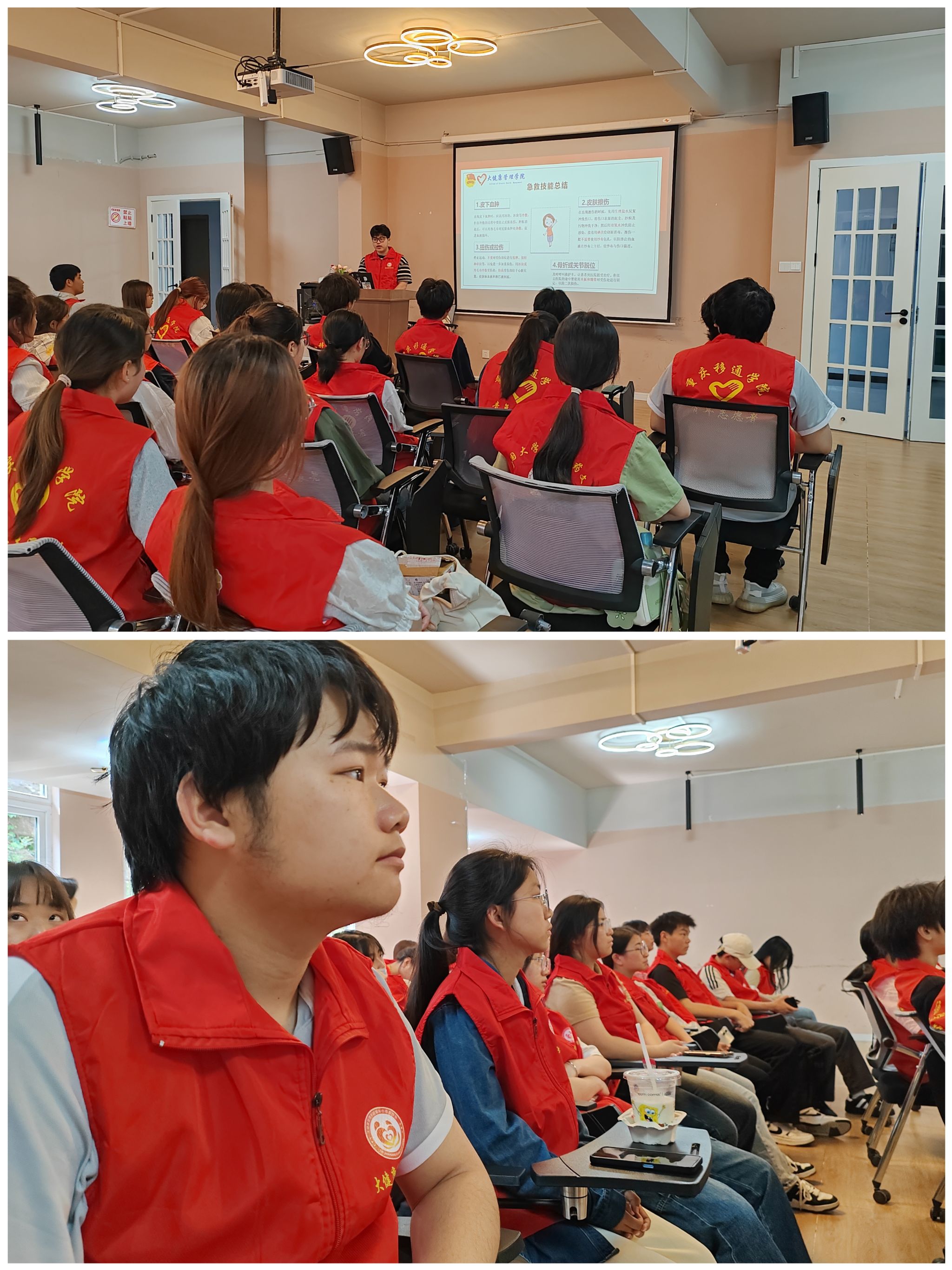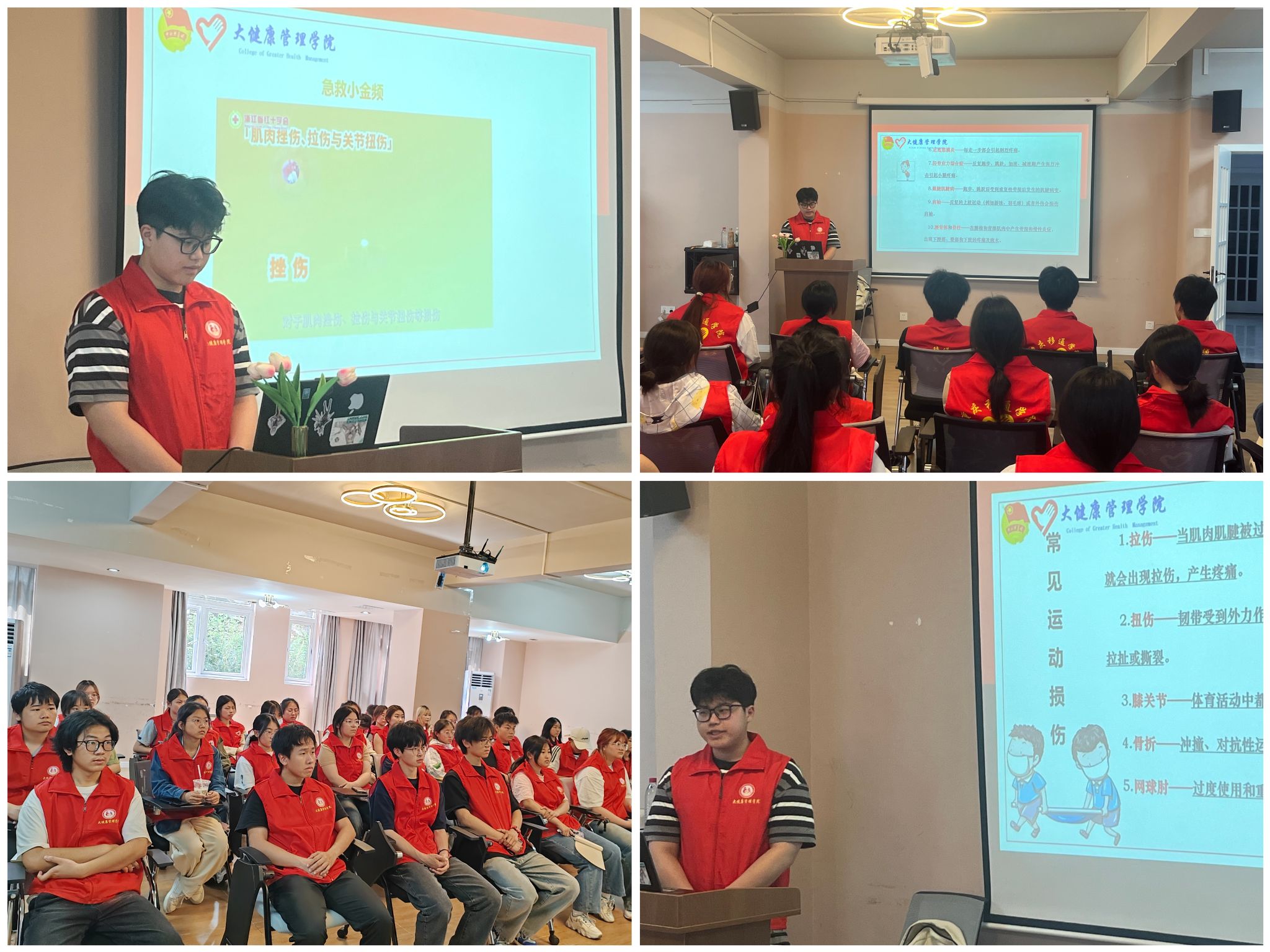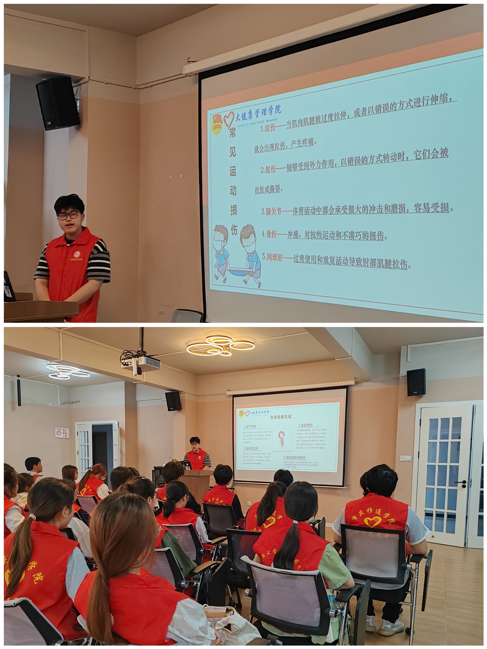 “急救知识是防患于未然的最好武器。”当运动员在竞技体育比赛之中,可能会遇到各种突发状况。活动开始,主讲人汪圣骐部长为各位健管志愿者们讲解宣传了体育创伤的急救知识。例如——“拉伤、扭伤、骨折.......”等各种常见的运动损伤是怎样造成的,以及在遇到这种伤情应该如何及时处理,可以避免我们伤情加重以及快速得到恢复。在宣讲中,健管志愿者们意识到“受伤往往无法避免,但可以采取积极措施达到伤害最小化,获益最大化。”让在座的每个健管志愿者意识到了解创伤急救的重要性。