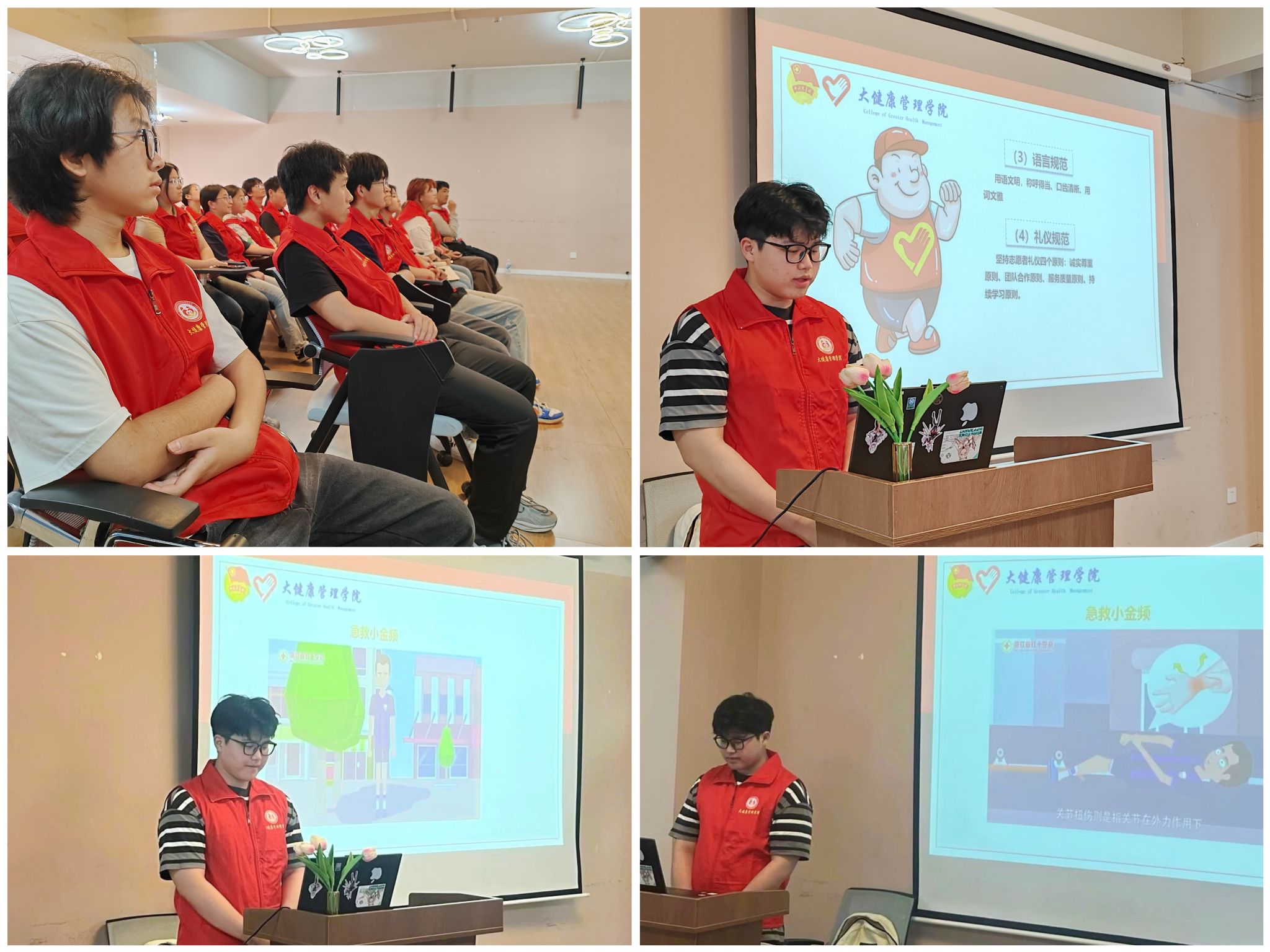 春光耀眼,春风和煦。为了加深健管学子对体育经纪人了解,以及在体育事业蓬勃发展的今天,让同学们更加了解这个专业的发展与前景;同时让提升健管学子的自身能力,提高对体育创伤急救知识的了解,使健管学子们可以在突发状况中采取合理科学的解决措施,大健康管理学院青年志愿者协会和大健康管理学院书院发展部联合在2024年4月14日下午15:00-17:00綦河书院三号楼小石潭·多功能室开展,此次体育经纪人暨校运动会志愿者培训主讲人由大健康青协行政部部长汪圣骐担任。