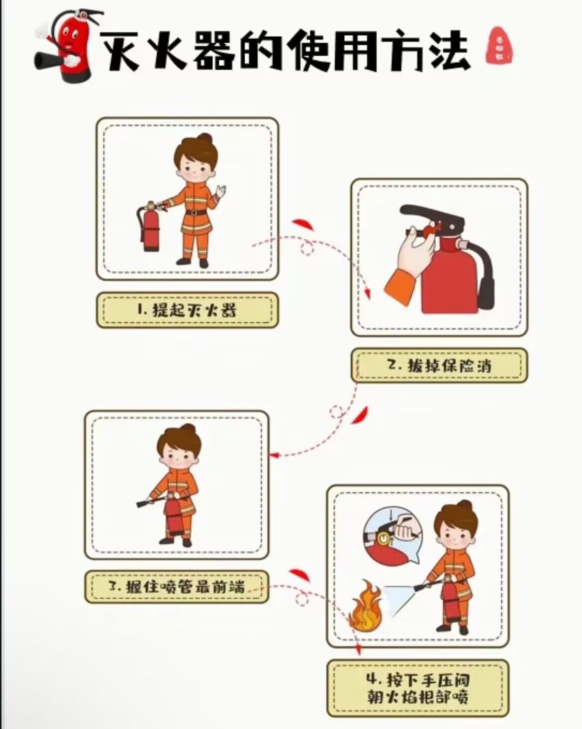 灭火器的使用步骤分为提、拔、瞄、按。提:首先我们拿着灭火器上面的把手,把灭火器提起来。拔:在拔去灭火器上面把手处的铁块材质的保险栓。瞄准起火点并保持大概5米左右的安全距离。同学们需要站在上风口使用灭火器,如果是干粉式灭火器,灰尘烟粉就会对大家的身体有所影响。所以必须一手提着灭火器的头,一手托在灭火器的底部,将灭火器的喷头瞄准起火的地方。按:对准火源使劲按下灭火器的交叉按压的地方,一直按压到火灭为止。