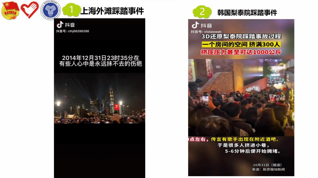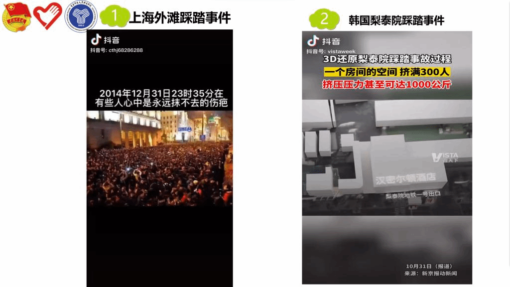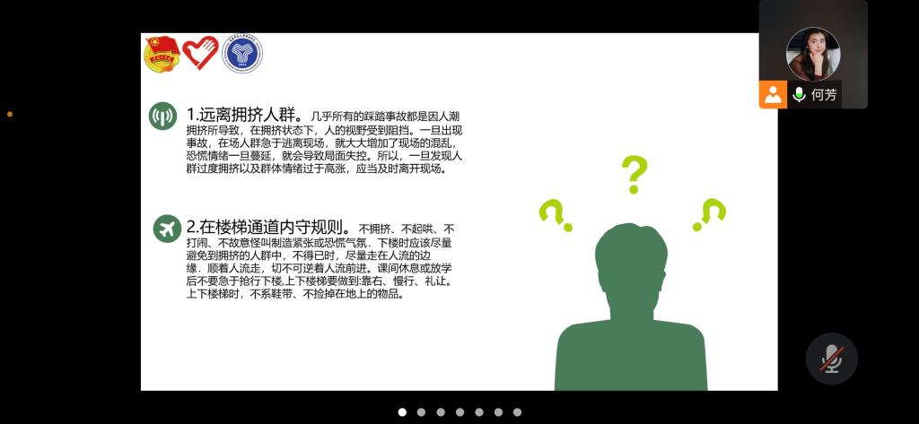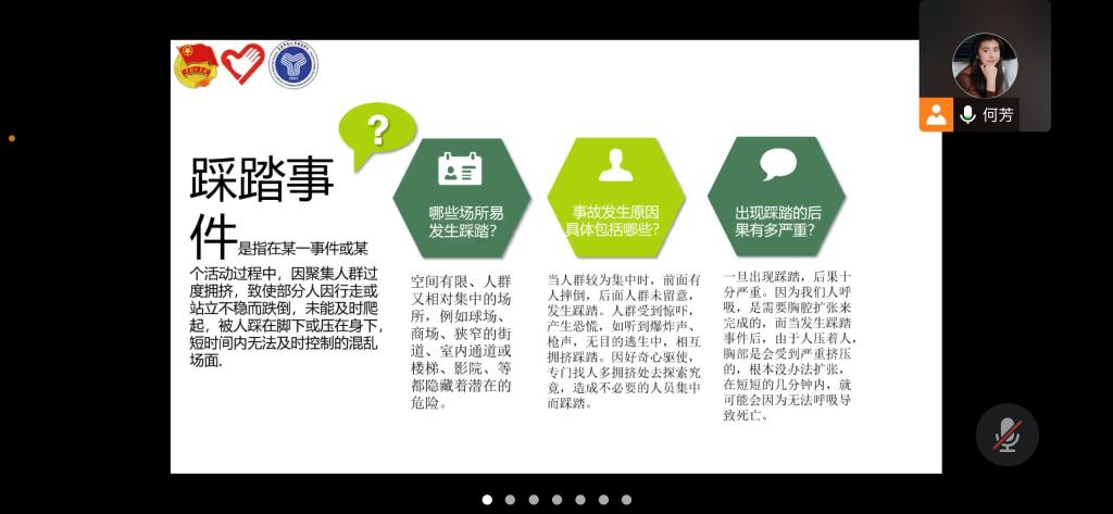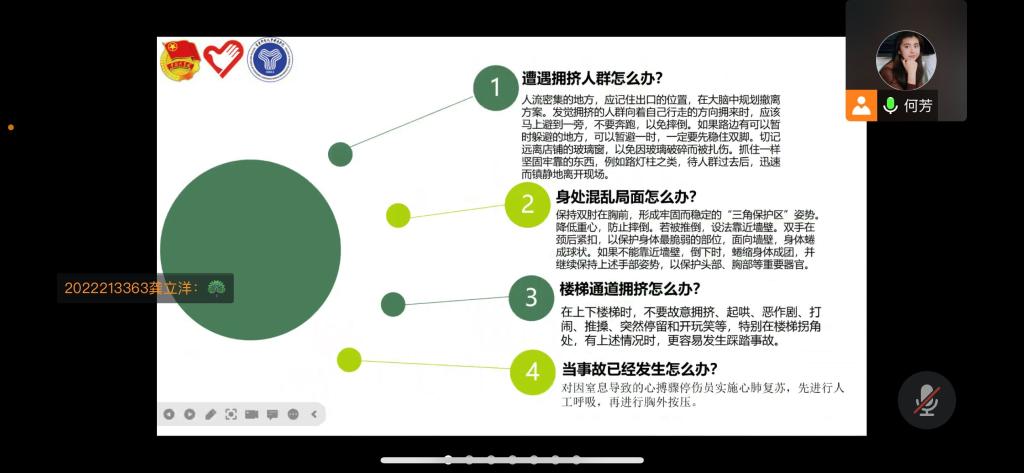 2014年上海外滩踩踏事故、韩国梨泰院踩踏事故虽然已经过去,但是这两件事情对人们造成的心里伤害却挥之不去,这两次踩踏事故都是因为游客市民围观时过于拥挤发生了踩踏事故,给众多家庭带来巨大的打击和伤害。因此大健康管理学院青年志愿者协会在2022年11月12日开展了预防踩踏的宣讲活动。由社会实践部部长何芳通过腾讯会议为同学们讲解具体注意事项。